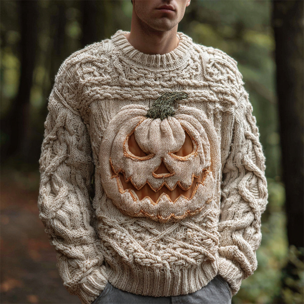 Halloween Pumpkin Light Art Men's Chunky Knit Crew Neck Sweater