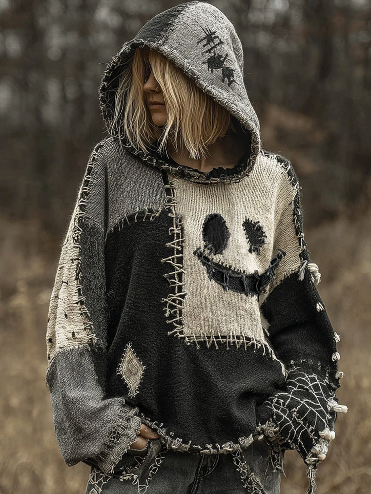 Halloween Spooky Face Patchwork Stitched Cozy Knit Hooded