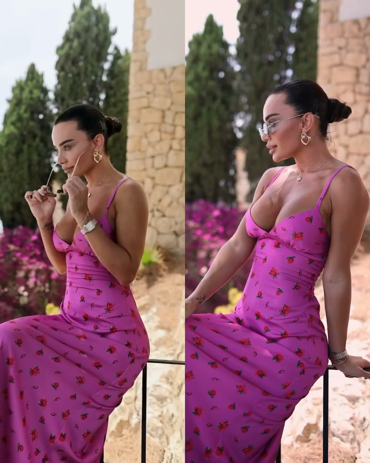 This dress is a vibrant and feminine piece. The hot pink color makes a bold statement, while the small red floral print adds a delicate and charming touch. It features thin spaghetti straps and a deep V - neckline, creating a flattering and sexy look.
