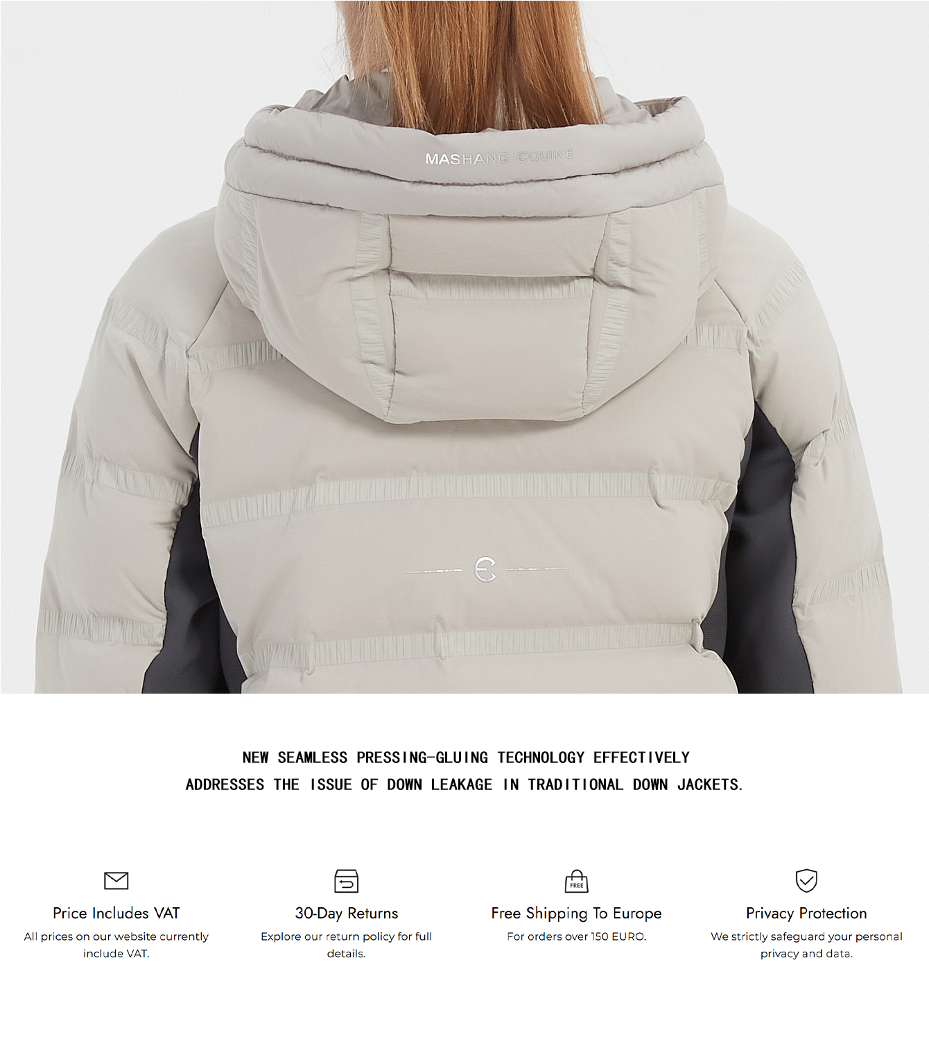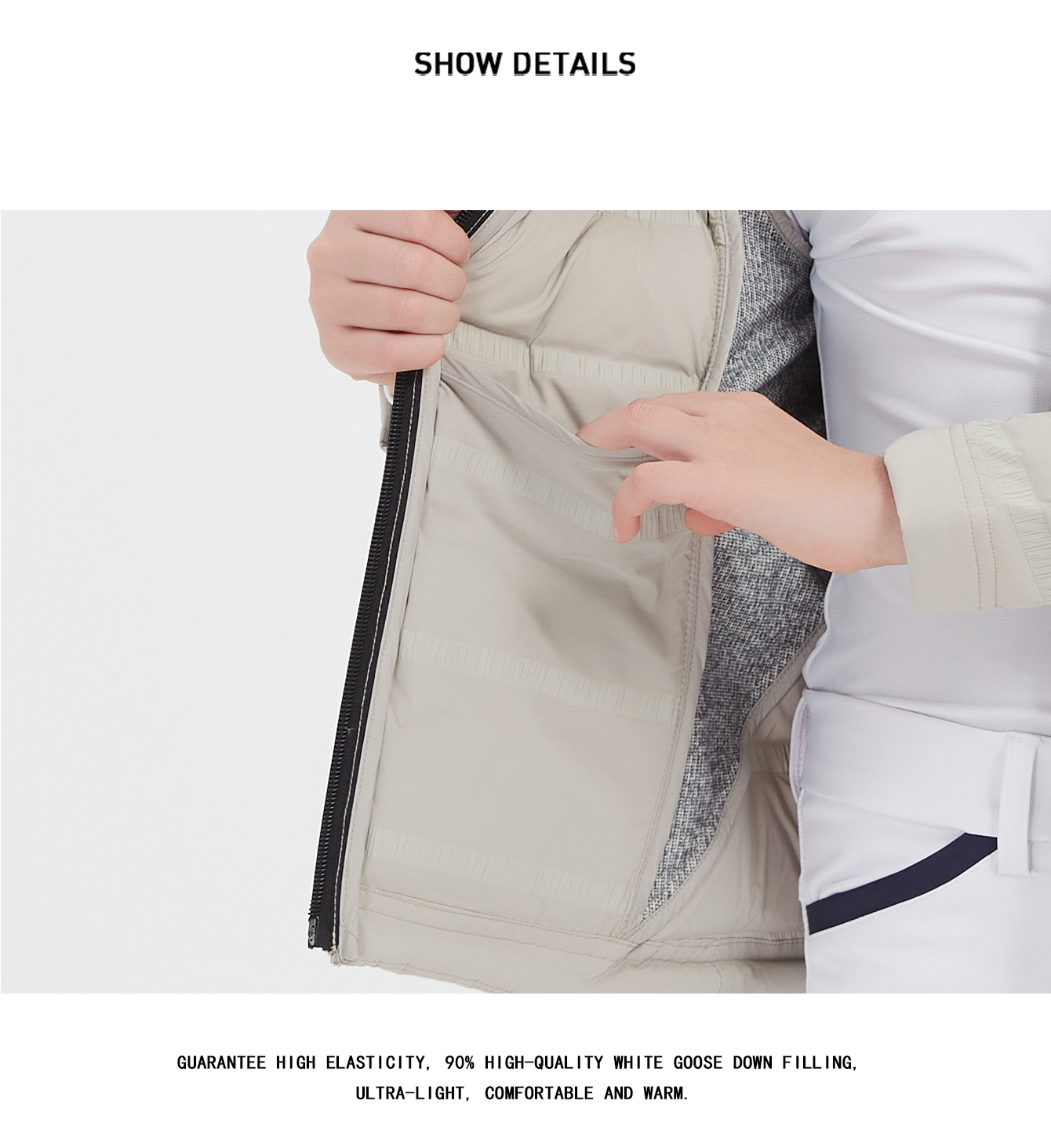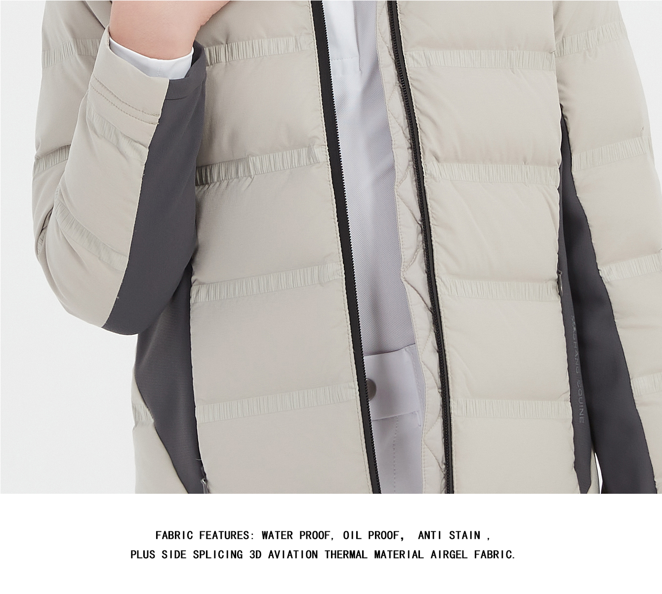 Fabric features: water proof, oil proof, anti stain ,plus side splicing 3D aviation thermal material airgel fabric, guarantee high elasticity, 90% high-quality white goose down filling, ultra-light, comfortable and warm. New seamless pressing-gluing technology effectively addresses the issue of down leakage in traditional down jackets.