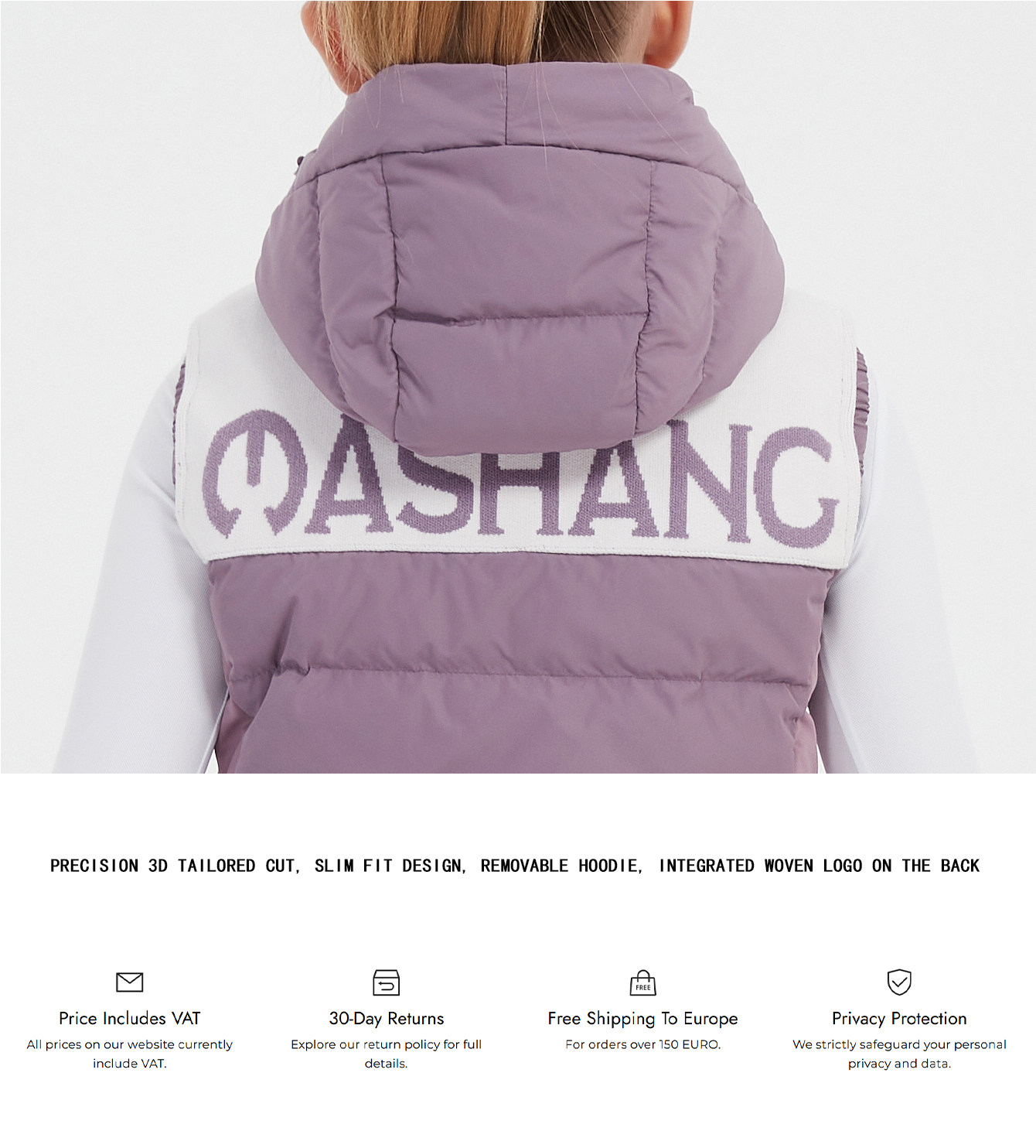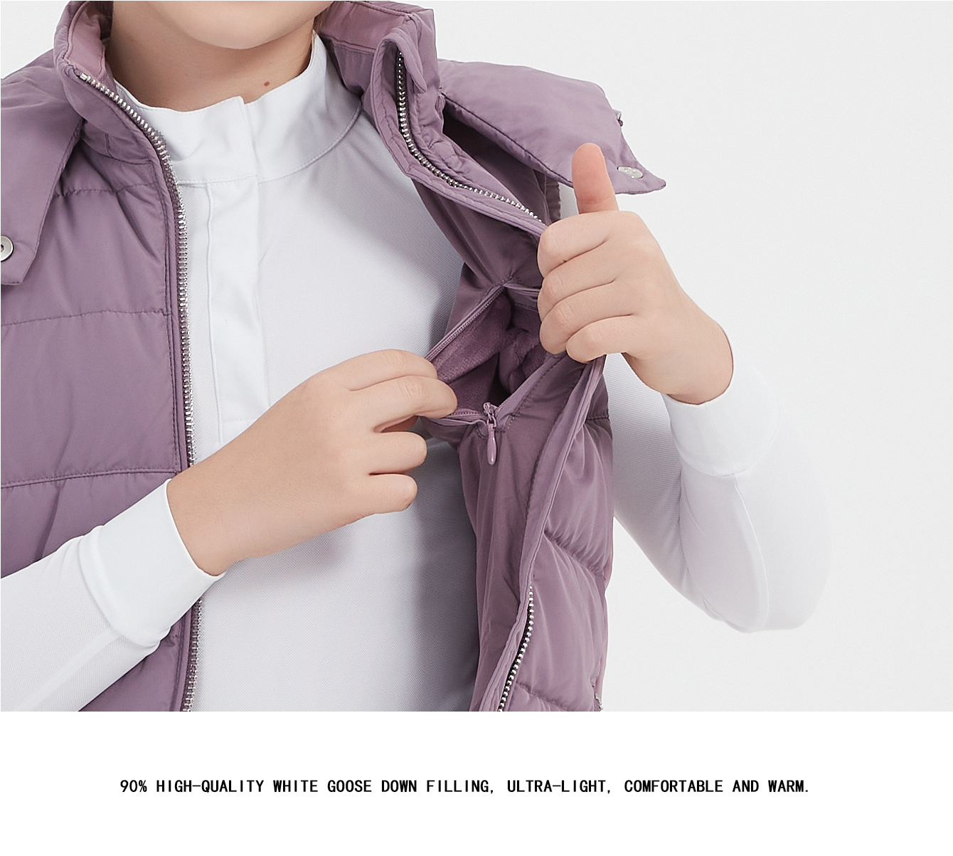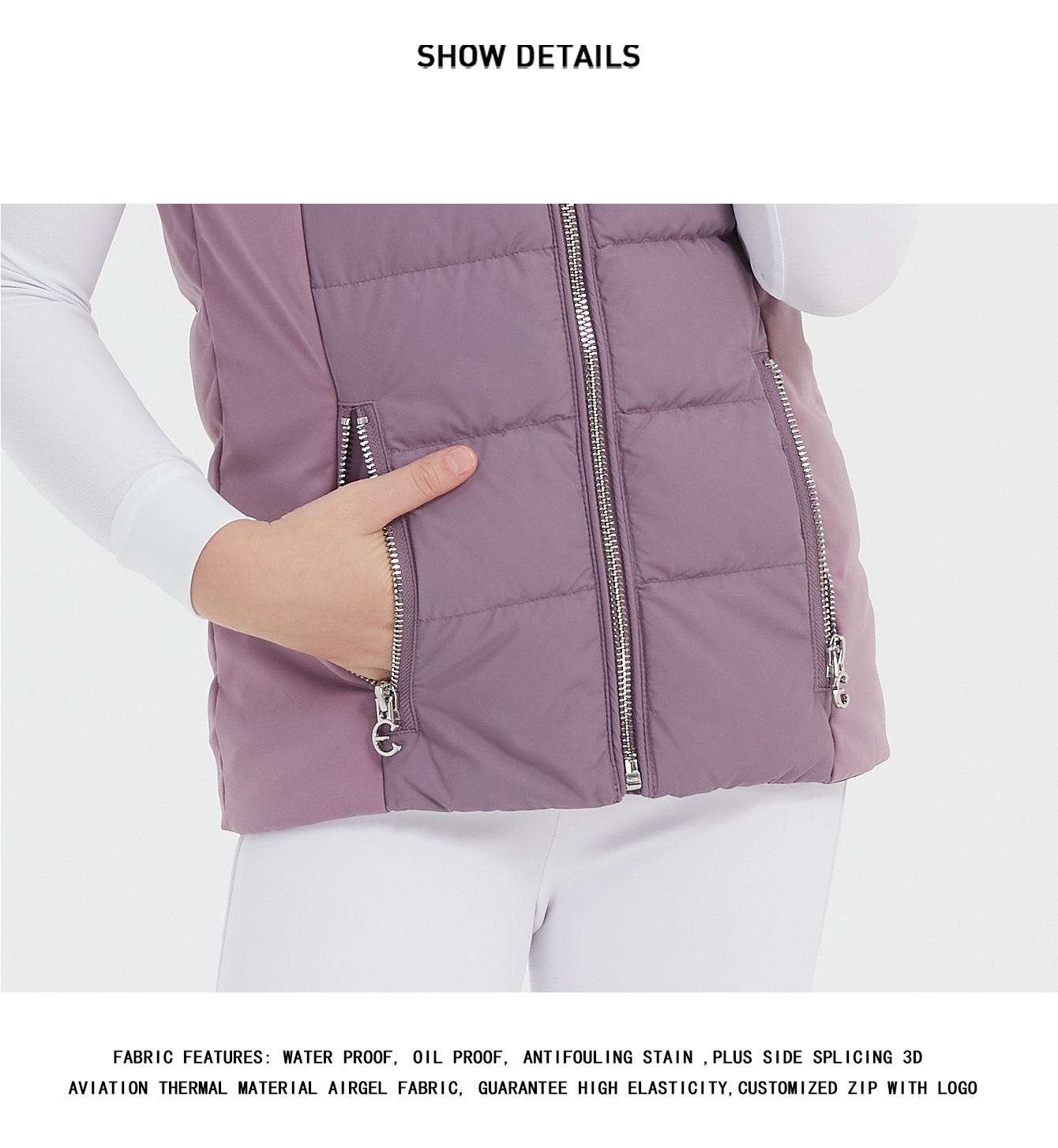Fabric features: water proof, oil proof, antifouling stain ,plus side splicing 3D aviation thermal material airgel fabric, guarantee high elasticity, 90% high-quality white goose down filling, ultra-light, comfortable and warm. precision 3D tailored cut, Slim Fit design, removable hoodie, integrated woven logo on the back, customized ZIP with logo.