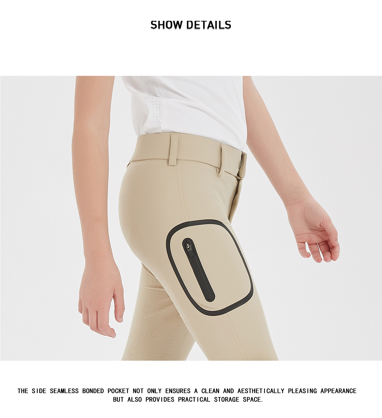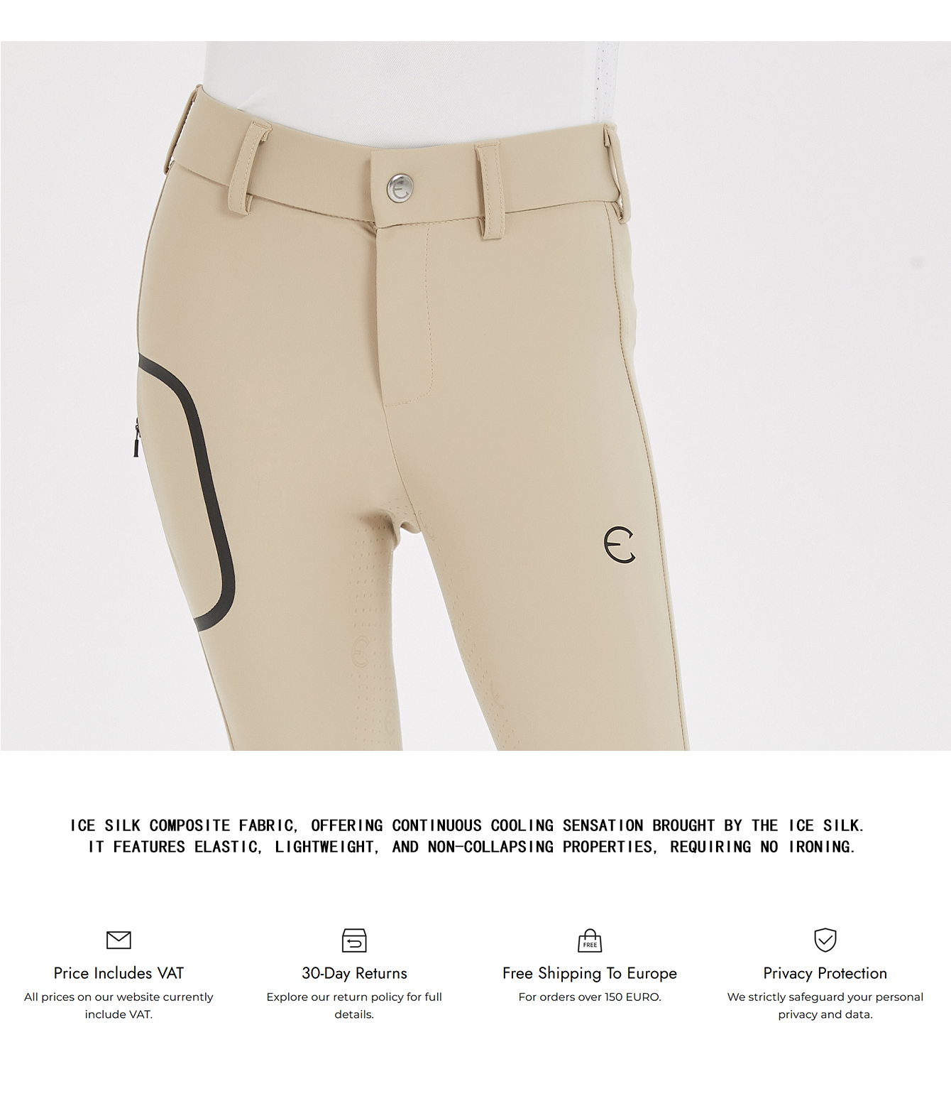 Mashang Equine Cuprammonia fiber laminated fabric:Cuprammonia fiber,giving constant cooling feel, ultra light, stretch, wrinkle resistant; Design Feature: Seamless pressing glue pocket, full grip. YKK zip, customized button made in Germany