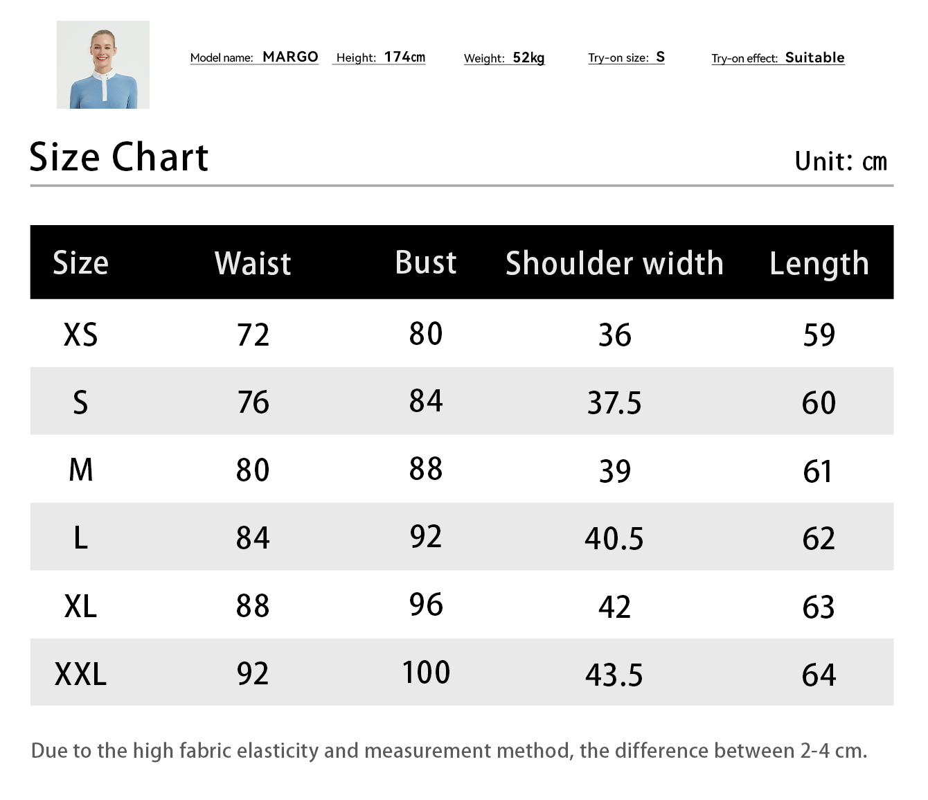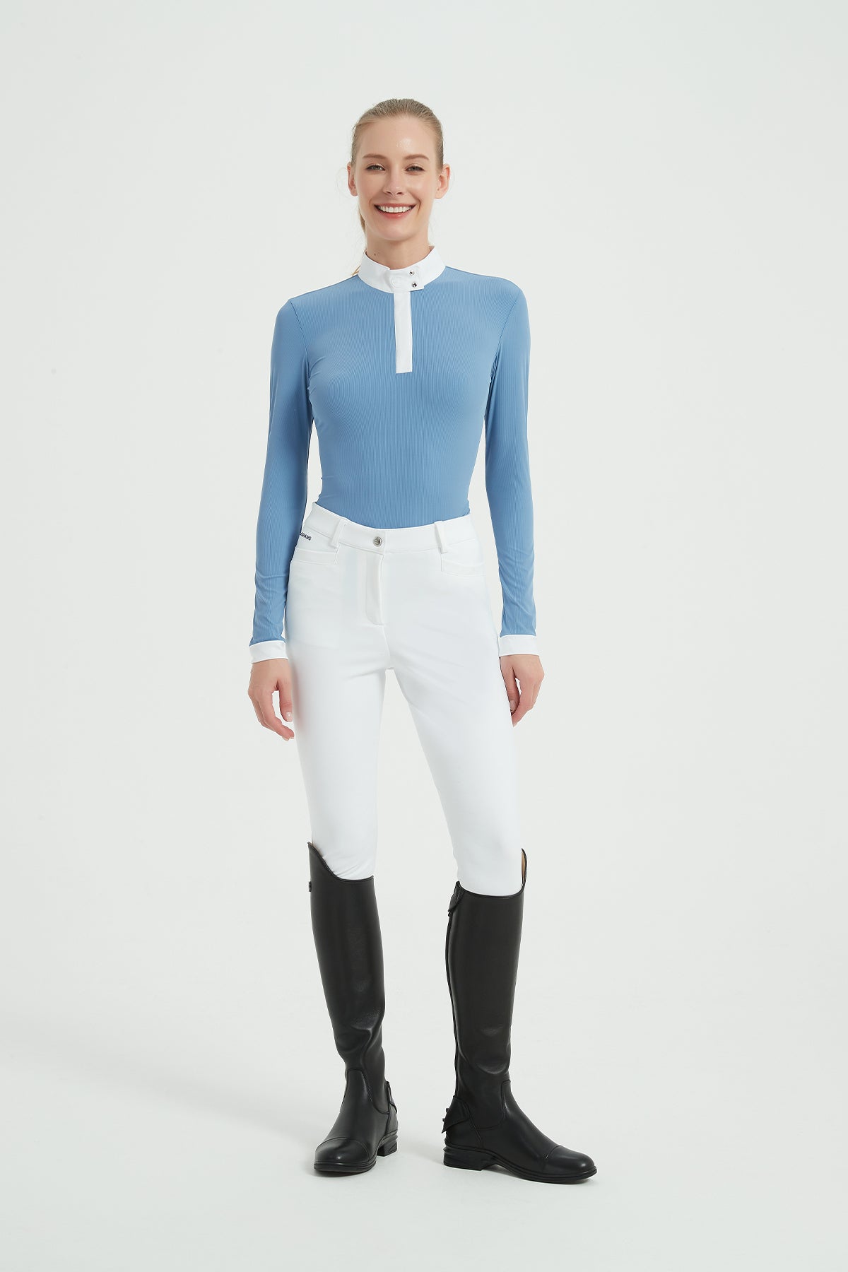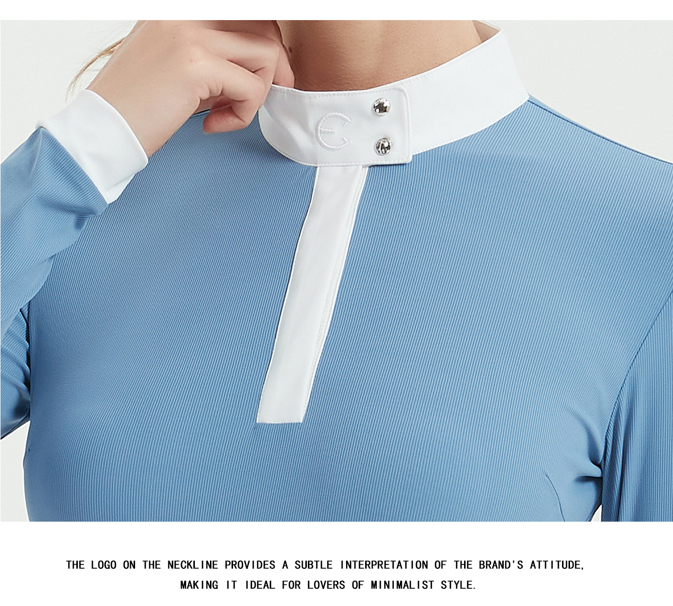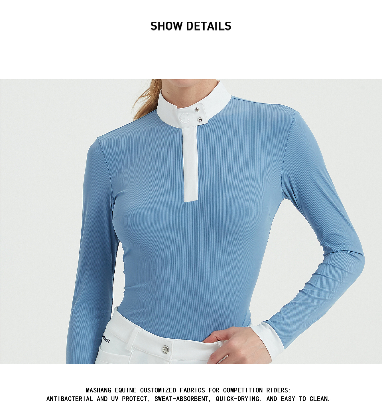 Mashang Equine customized fabrics for competition riders:Antibacterial and UV protect, sweat-absorbent, quick-drying, and easy to clean. Customized magnetic opening on the neckline + invisible hidden buckle design, easy for riders put on and take off shirt.