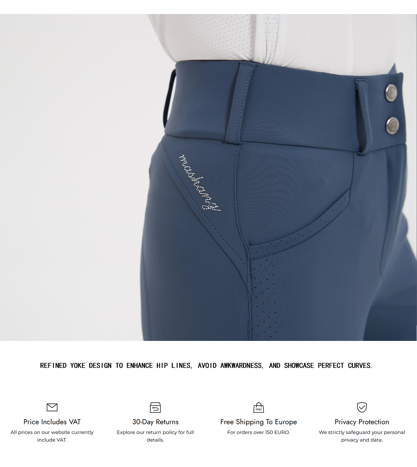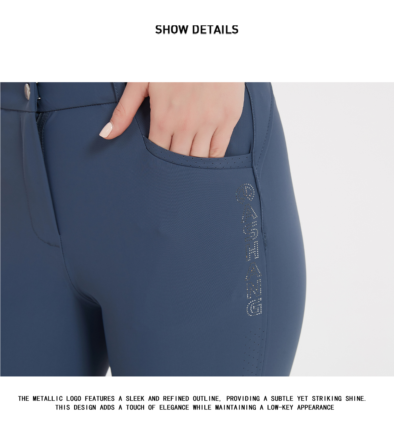 Mashang Equine top selling double layer laminated fabrics subject to many years testing: highly elastic, strech, easy to care, not easy to deform, soft and skin friendy.Design Features: Innovative manufacture process, seamless lamination technology , reducing the friction caused by sewing sweed, larger area of grip adds a no-slip grip, high waiste, metal shining logo, YKK Zip, customized button made in Germany.