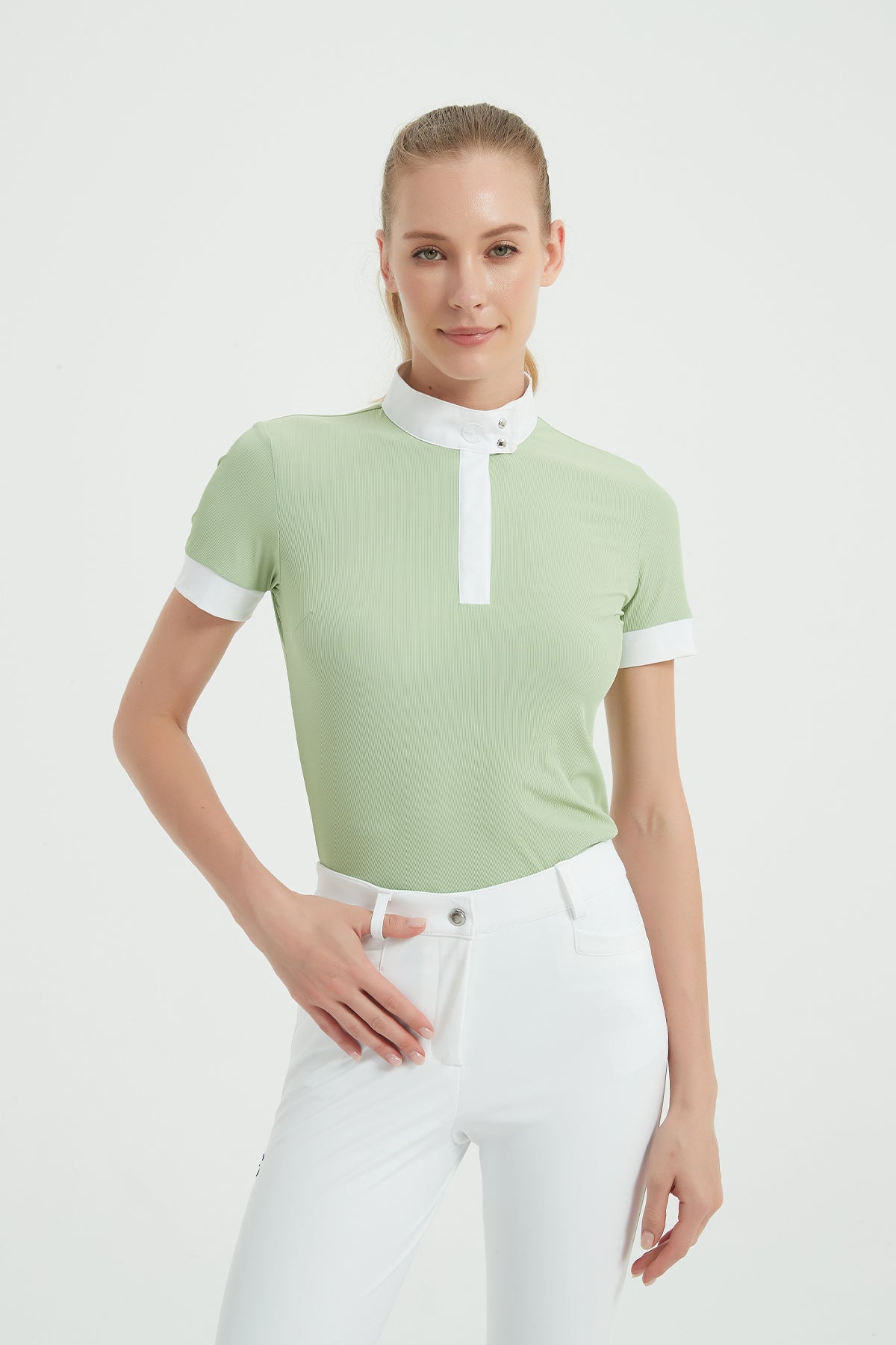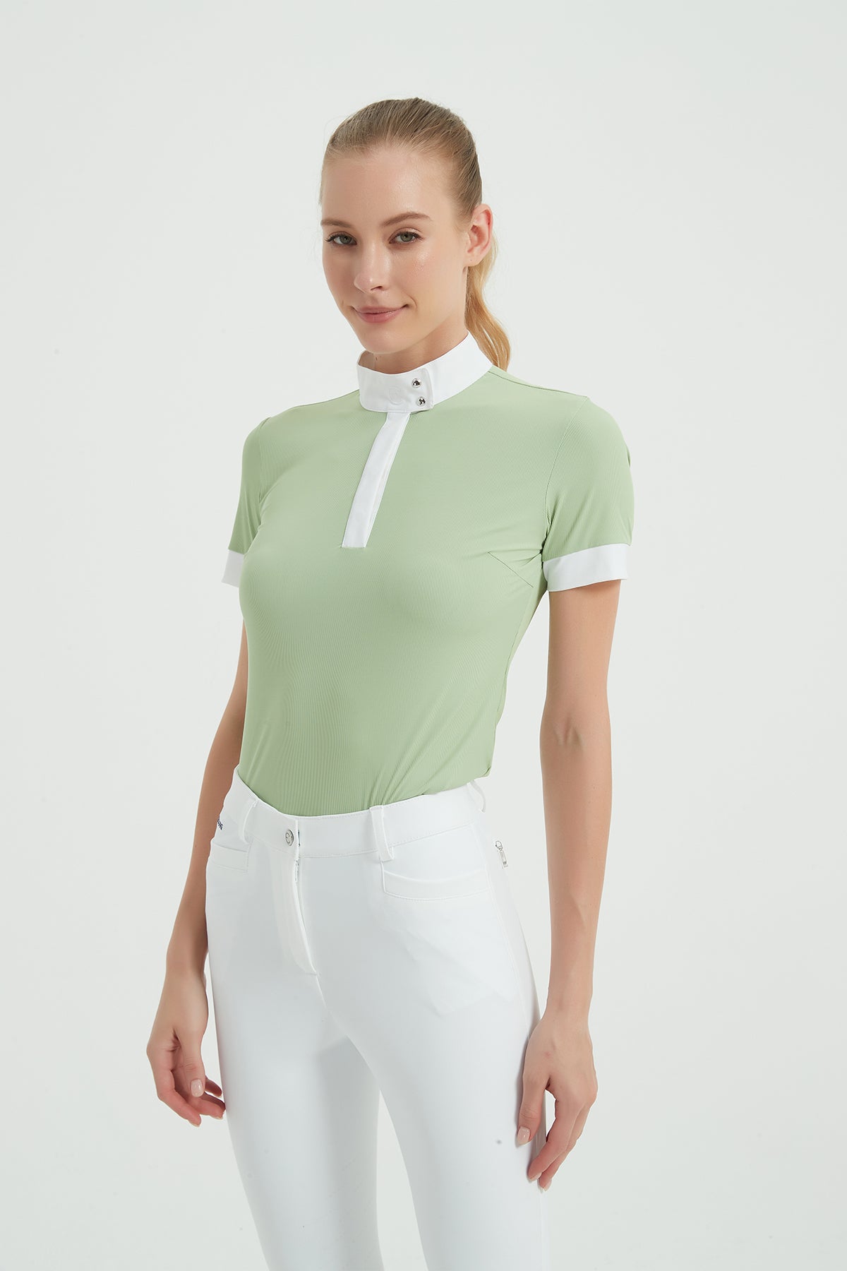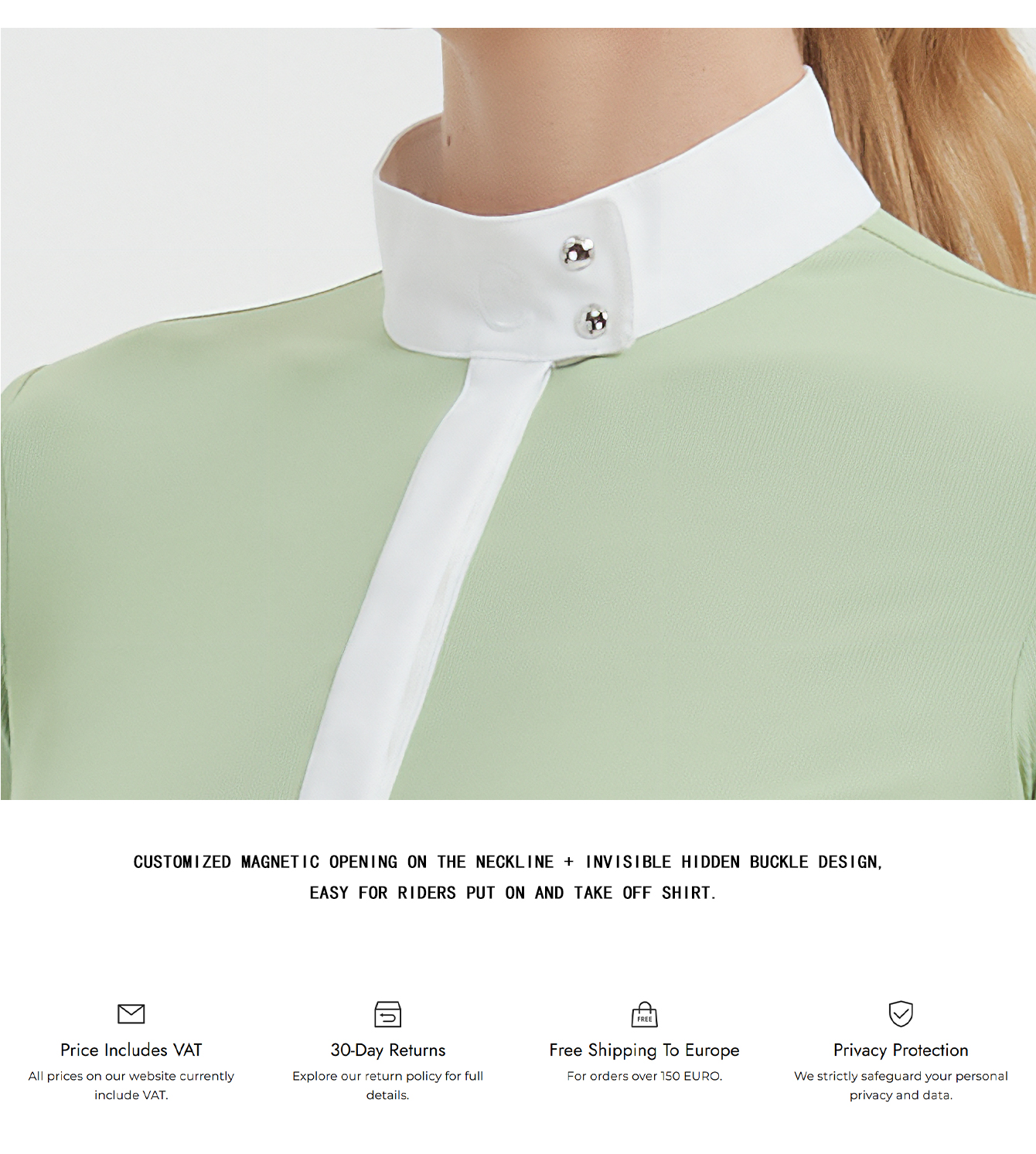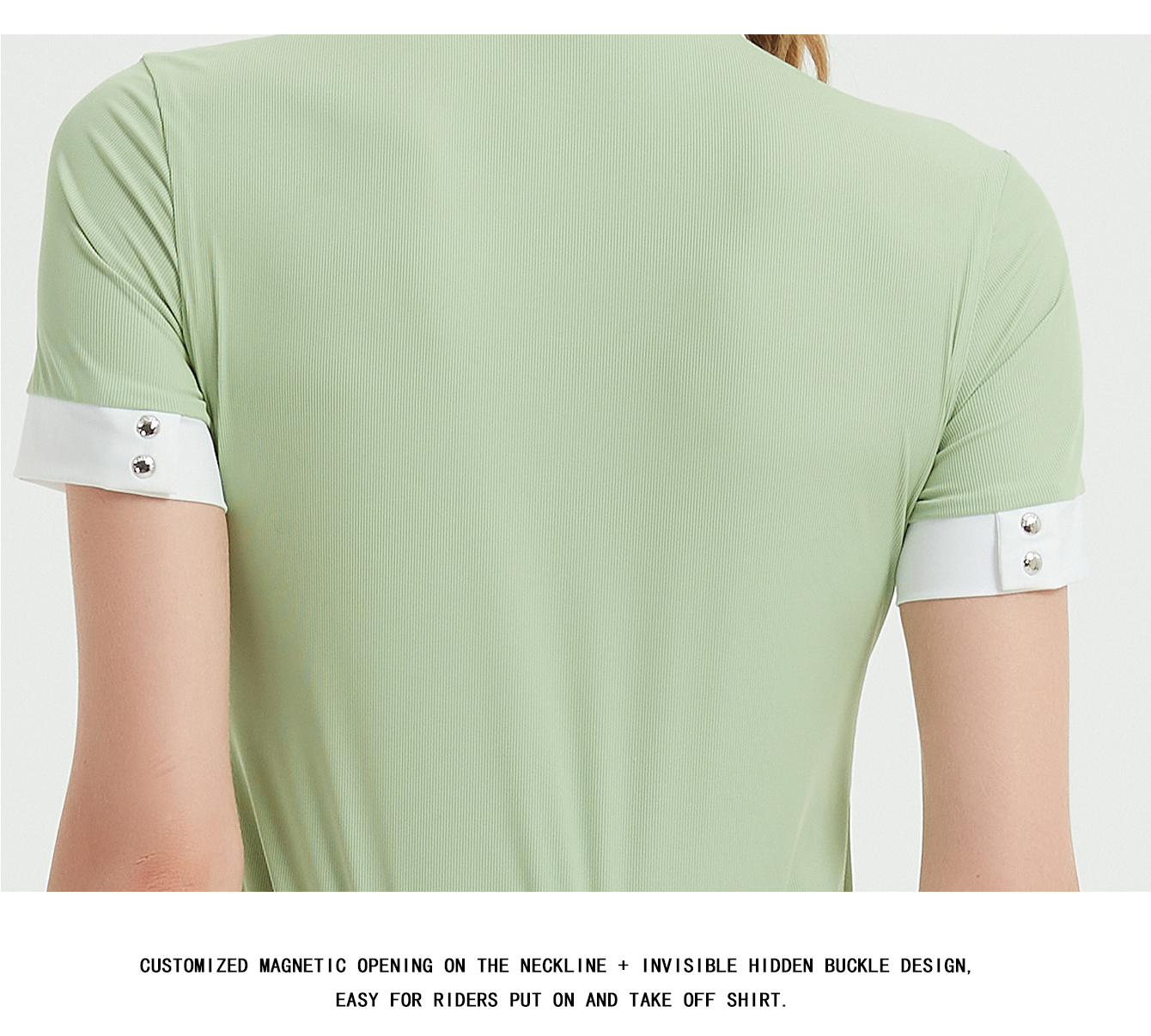 Mashang Equine customized fabrics for competition riders:Antibacterial and UV protect, sweat-absorbent, quick-drying, and easy to clean. Customized magnetic opening on the neckline + invisible hidden buckle design, easy for riders put on and take off shirt.