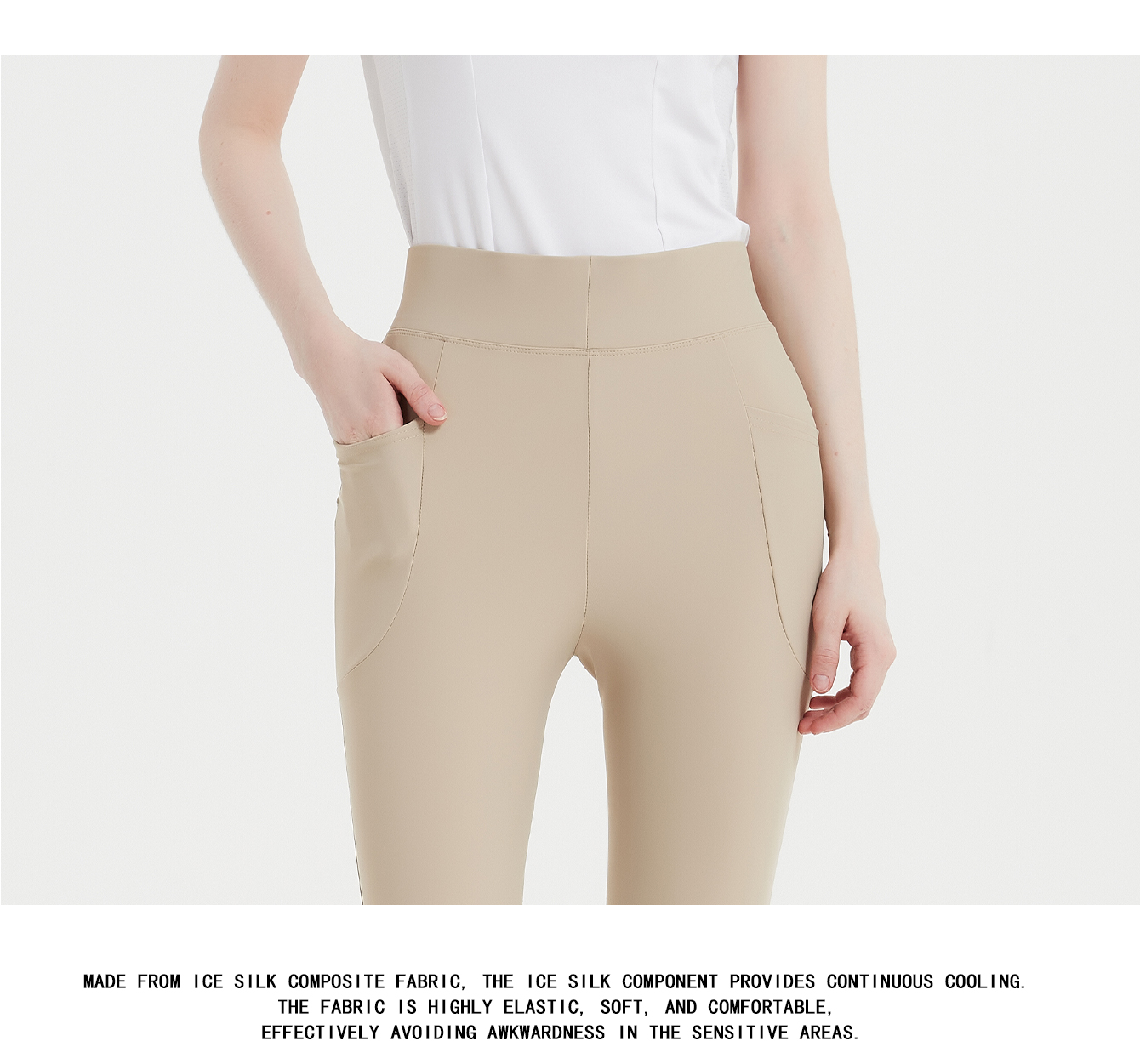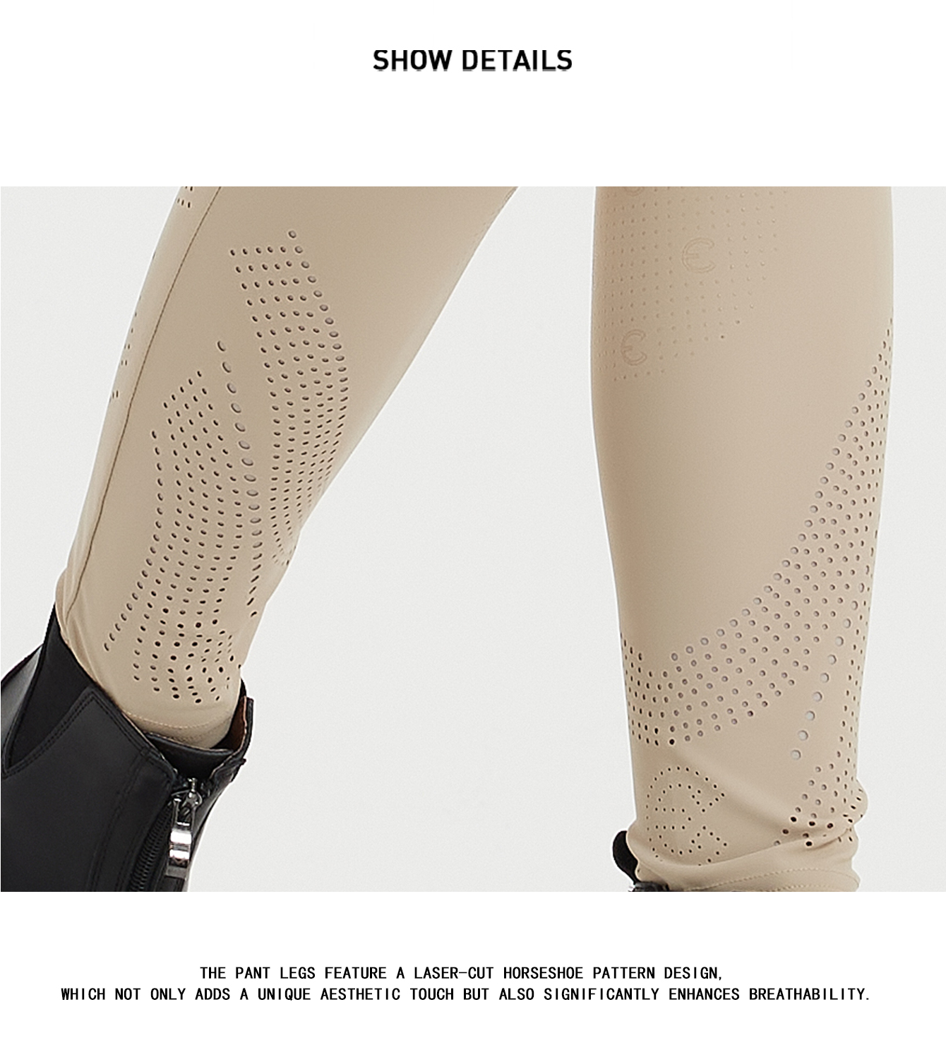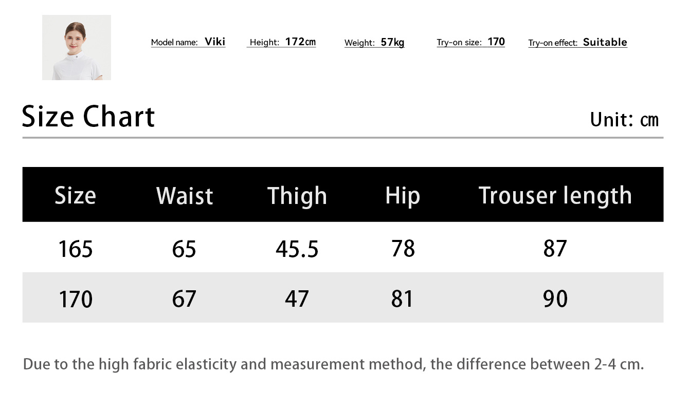 Mashang Equine Cuprammonia fiber laminated fabric:Cuprammonia fiber,giving constant cooling feel, ultra light, stretch, wrinkle resistant; Manufacture Process:The trouser legs are designed with laser punched horseshoe pattern, highly breathable, semi-glue, high waist and hip lifting effect.