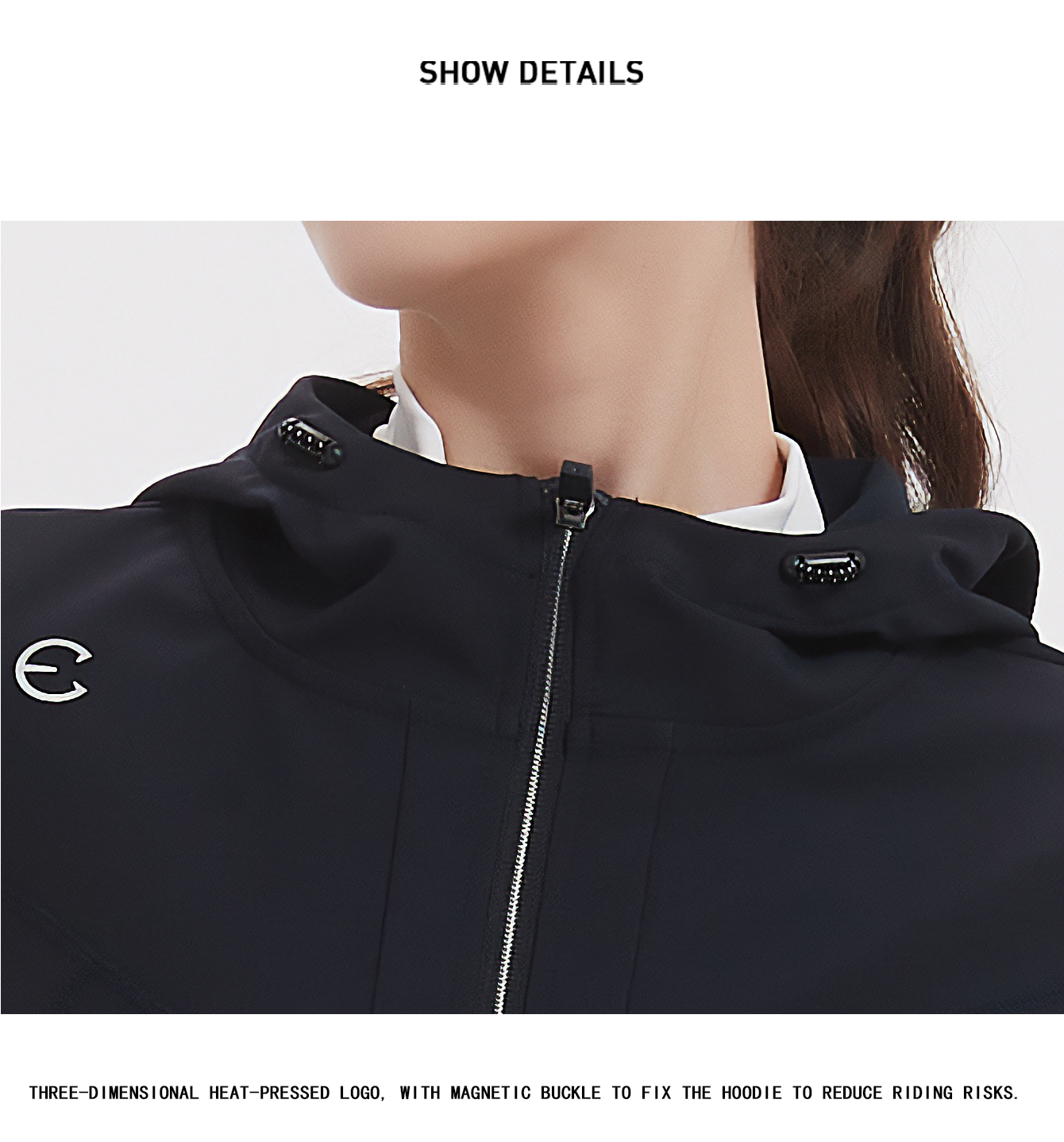 Mashang Equine double layer laminated velvet fabrics: high elastic, breathable, quick drying, anti-bacterial. Special wiring technology, customized zip, 3 D cutting, three-dimensional heat-pressed logo, with magnetic buckle to fix the hoodie to reduce riding risks.