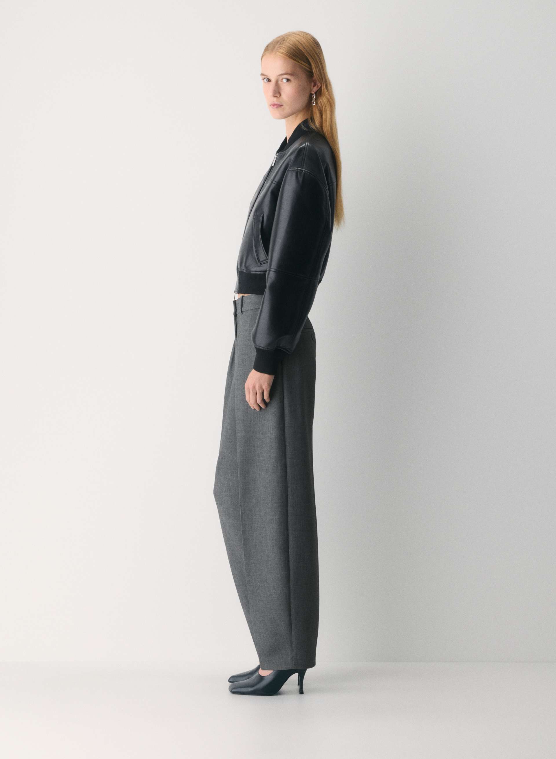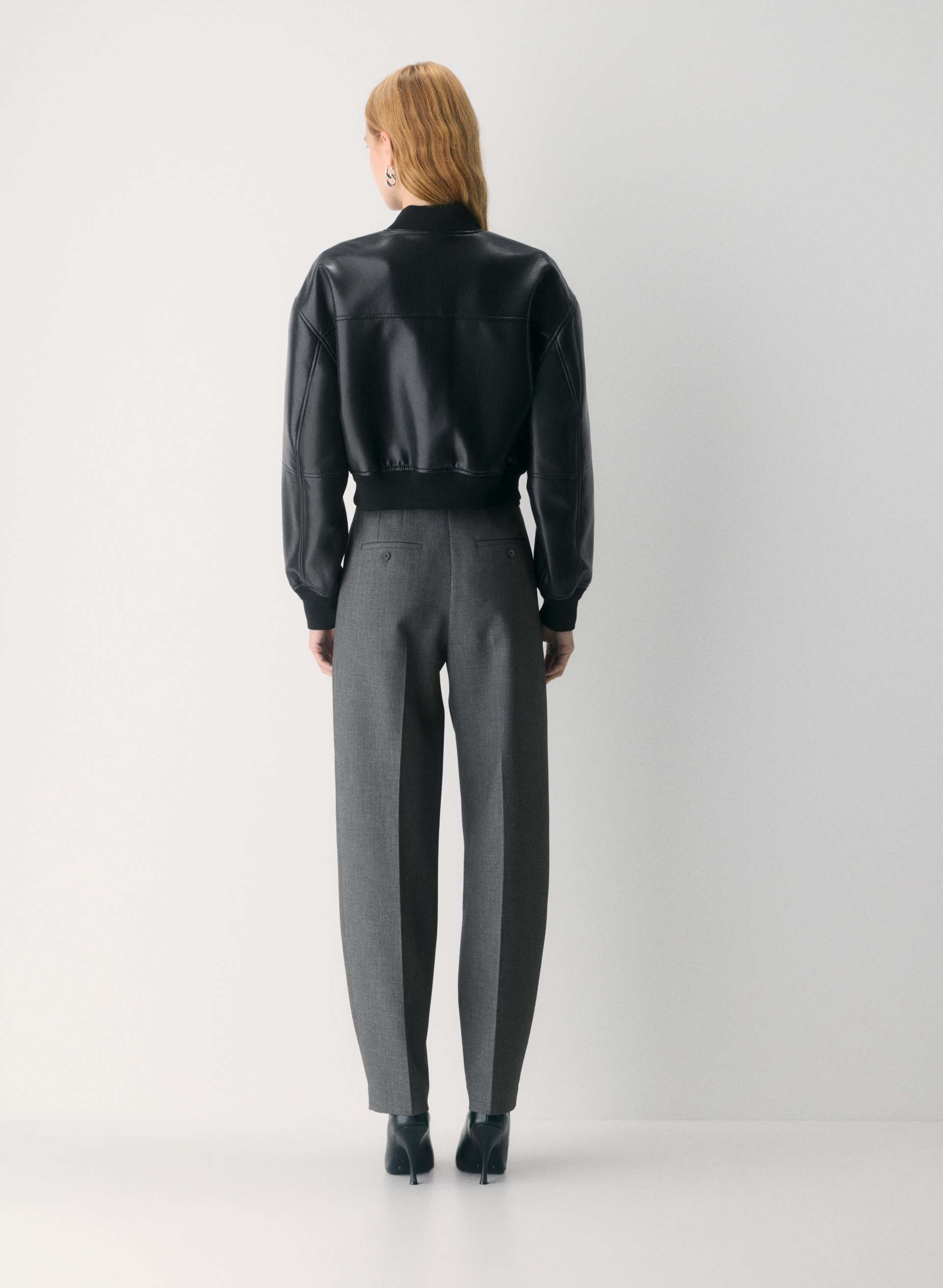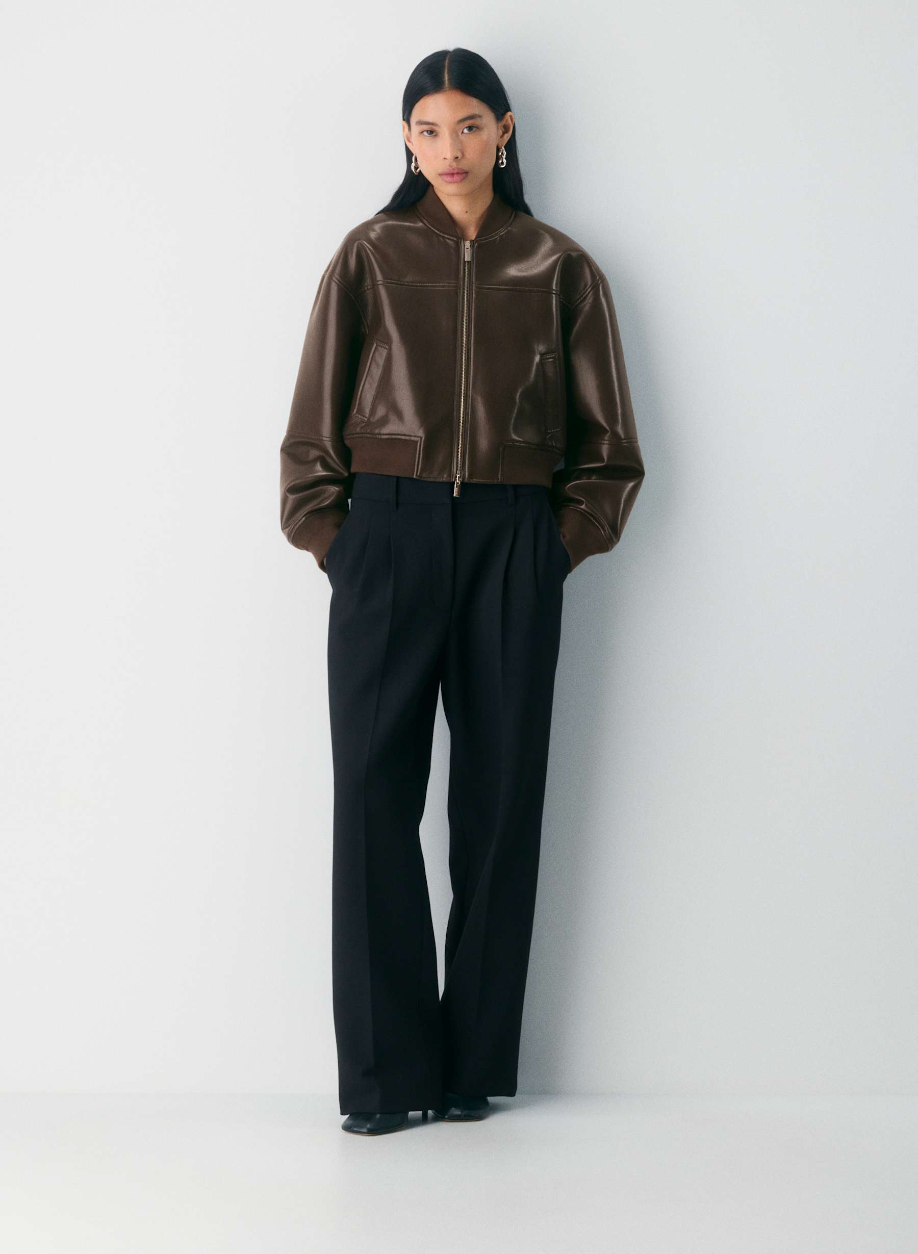 This leather bomber jacket features a classic collar, a front zipper closure, and two side pockets. The jacket has a slightly cropped length and puffed sleeves that end with ribbed cuffs. Paired with black wide - leg trousers, it creates a stylish and edgy look. The jacket's design is versatile, suitable for both casual and semi - formal occasions, adding a touch of sophistication and a trendy vibe to any outfit.