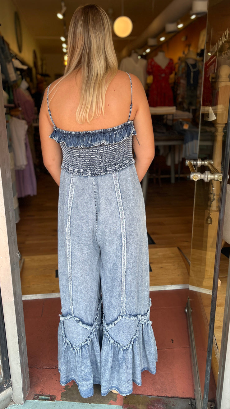 This light blue denim jumpsuit features a strapless top with smocked detailing, adding texture and a fitted look. The wide - leg pants have ruffled hems with frayed edges, giving the outfit a playful and bohemian vibe. Paired with espadrille sandals, layered necklaces, and bracelets, it's perfect for a casual day out, perhaps shopping or a laid - back social gathering.