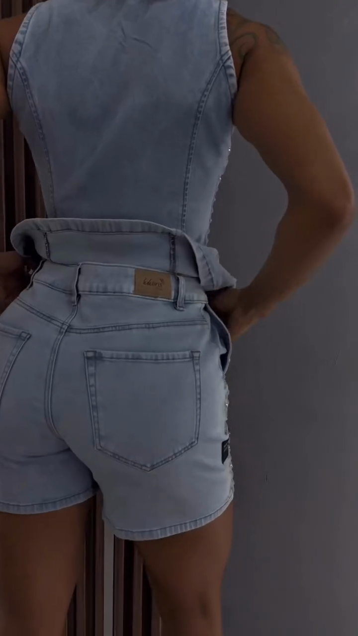 This set features a light blue denim vest adorned with numerous small, shiny embellishments. The vest has a square neckline and a front - button design, leaving a peek of midriff. Paired with matching light blue denim shorts, also decorated with the same embellishments, it creates a coordinated and eye - catching look. Ideal for casual outings, summer parties, or a night out, it can be paired with strappy heels to elevate the style.
