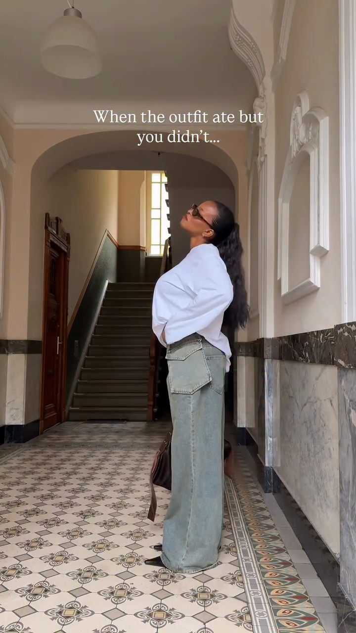 These light blue wide - leg jeans feature large side pockets, adding a utilitarian touch to their casual design. Paired with a white, loose - fitting long - sleeve top and a brown shoulder bag, they create a laid - back yet stylish look. The jeans' wide - leg silhouette is on - trend and suitable for a variety of casual occasions.