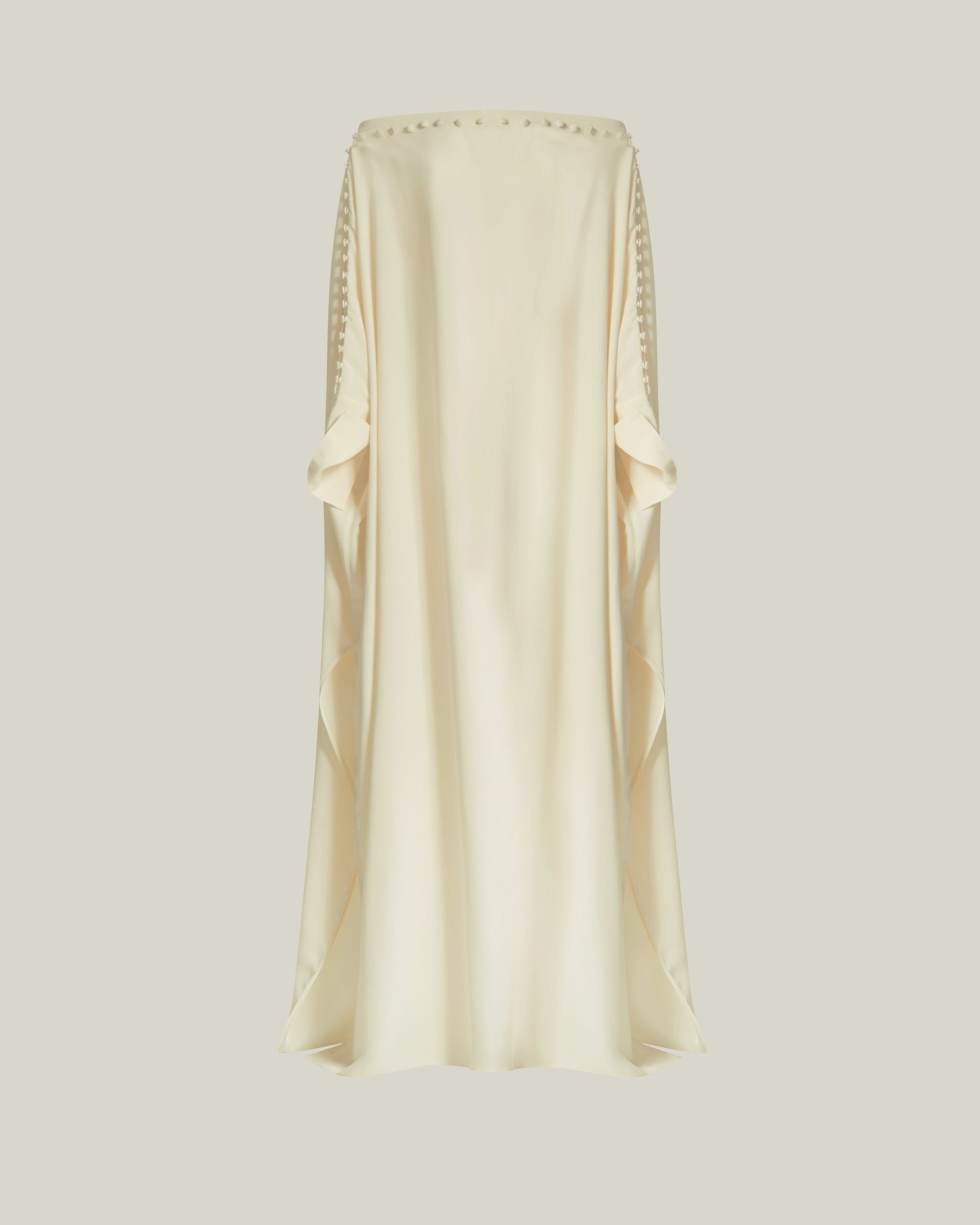 Minimalism and maximalism combined. The Kaftan is made from soft crepe cady and features a neckline formed by 60 hand-sewn buttons that allow you to choose how to wear it: off-the-shoulders, boat neckline, or one-shoulder. On its sides, two slits reveal your legs, making it even more playful.