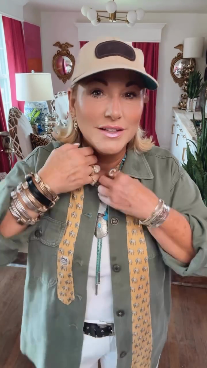 - Style: Casual, eclectic, and personalized, blending classic denim jacket elements with unique accessories.