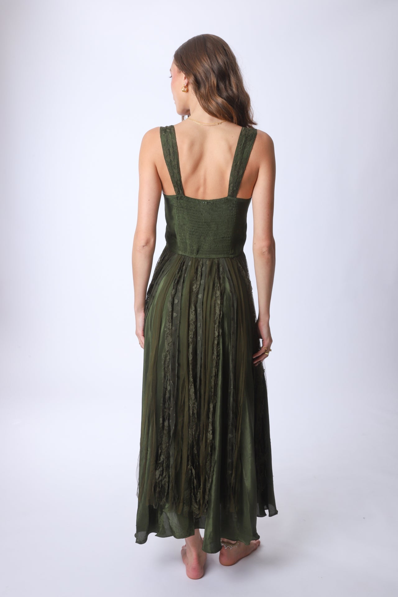 This olive green maxi dress exudes a romantic and bohemian charm. The bodice features a lace - up corset design, which cinches the waist and adds a vintage - inspired touch. The square neckline and thin shoulder straps highlight the collarbone and shoulders, enhancing the feminine silhouette.