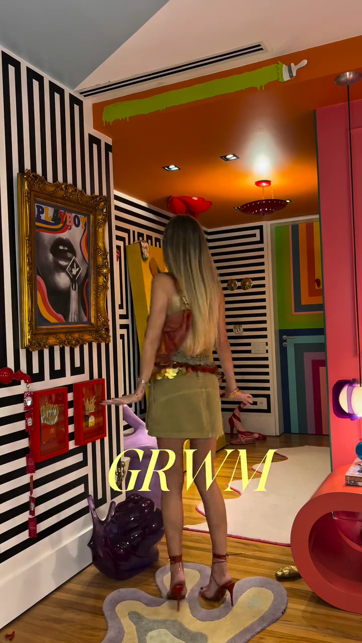 - Accessories: Red heels and brown handbag enhance the overall style.