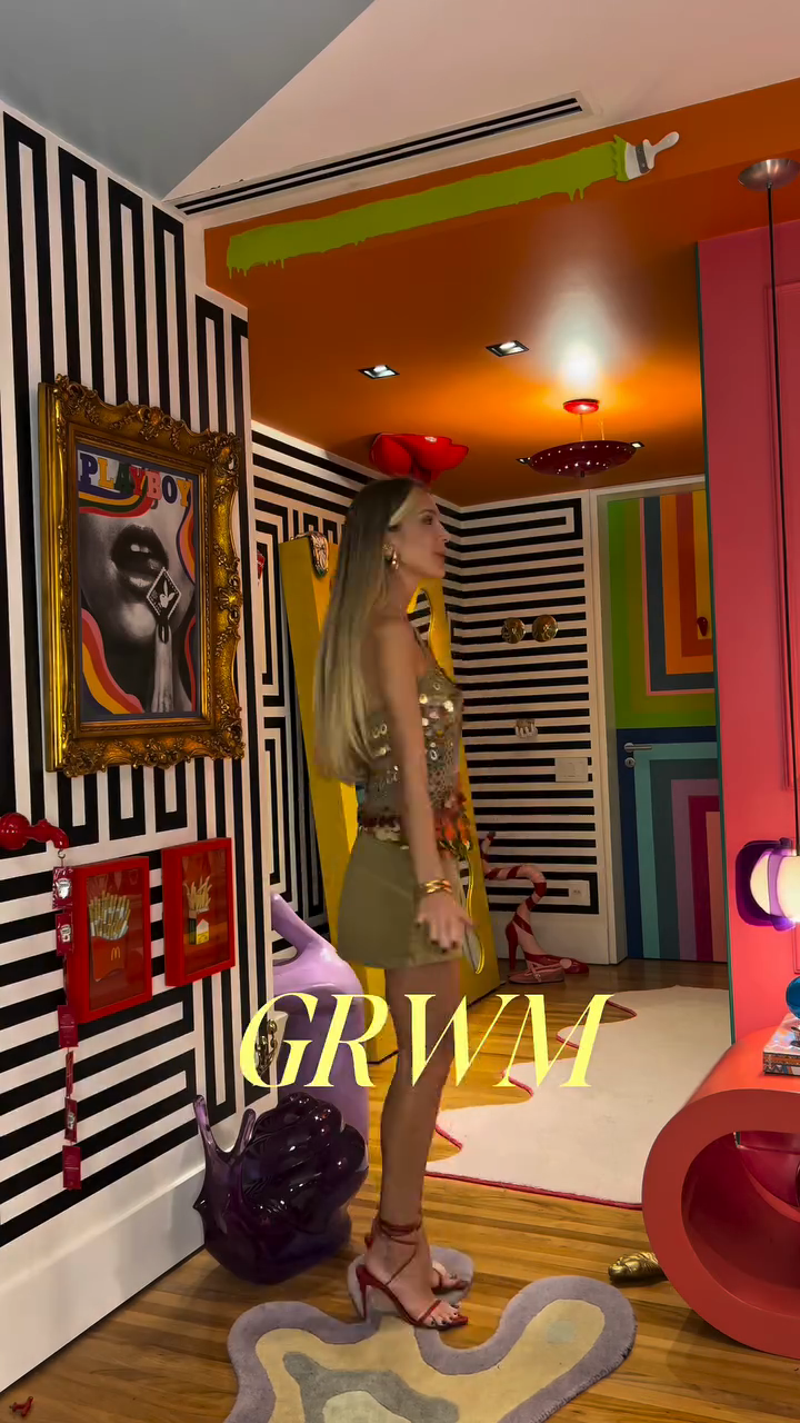 Paired with it is an olive green cargo mini skirt, which adds a utilitarian and casual contrast to the glitzy top. The skirt likely has multiple pockets, characteristic of cargo - style clothing. The ensemble is completed with red strappy high - heeled sandals and a brown handbag, suitable for a night out at a trendy club or a fashionable social event.