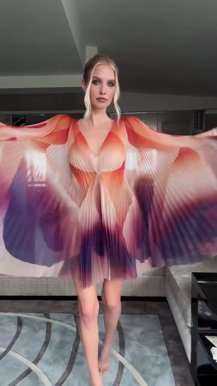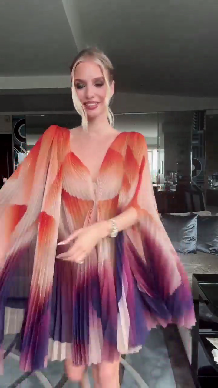 Make a striking fashion statement with this Ombre Pleated Mini Dress. The gradient ombre pattern transitioning through warm and cool hues, deep V - neckline, and dramatic flutter sleeves create a bold and elegant look. Ideal for special events, parties, or upscale gatherings, it stands out with its unique design.