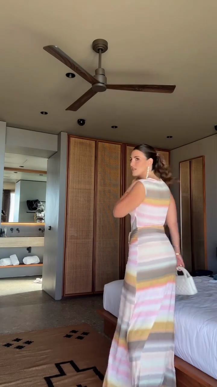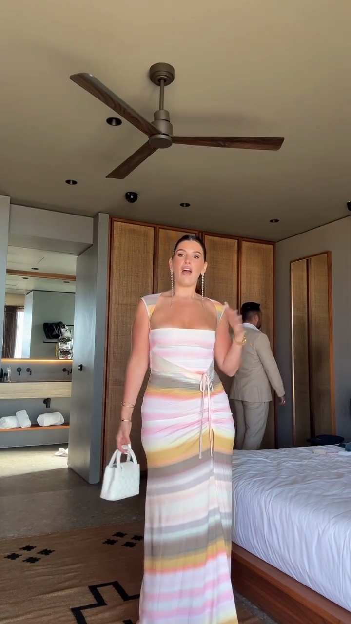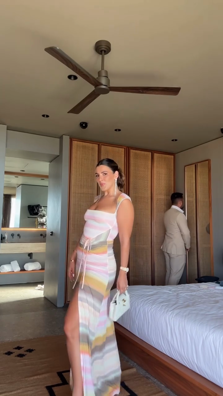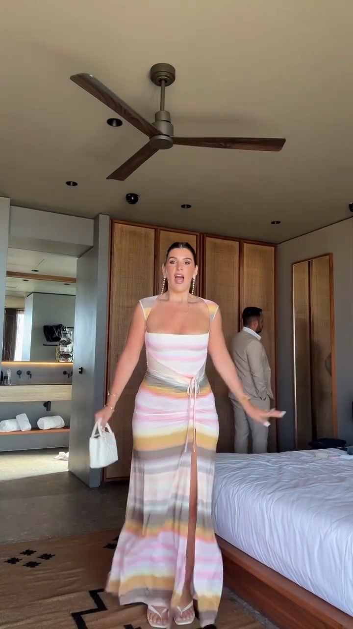 This dress features a square neckline and a form - fitting bodice that accentuates the figure. It showcases a pattern of pastel stripes in colors like pink, yellow, and beige, creating a soft and summery look. The dress has a high side slit, adding a touch of allure, and it's cinched at the waist with a tie. Paired with delicate sandals and a small white handbag, it's suitable for semi - formal events or a stylish evening out.