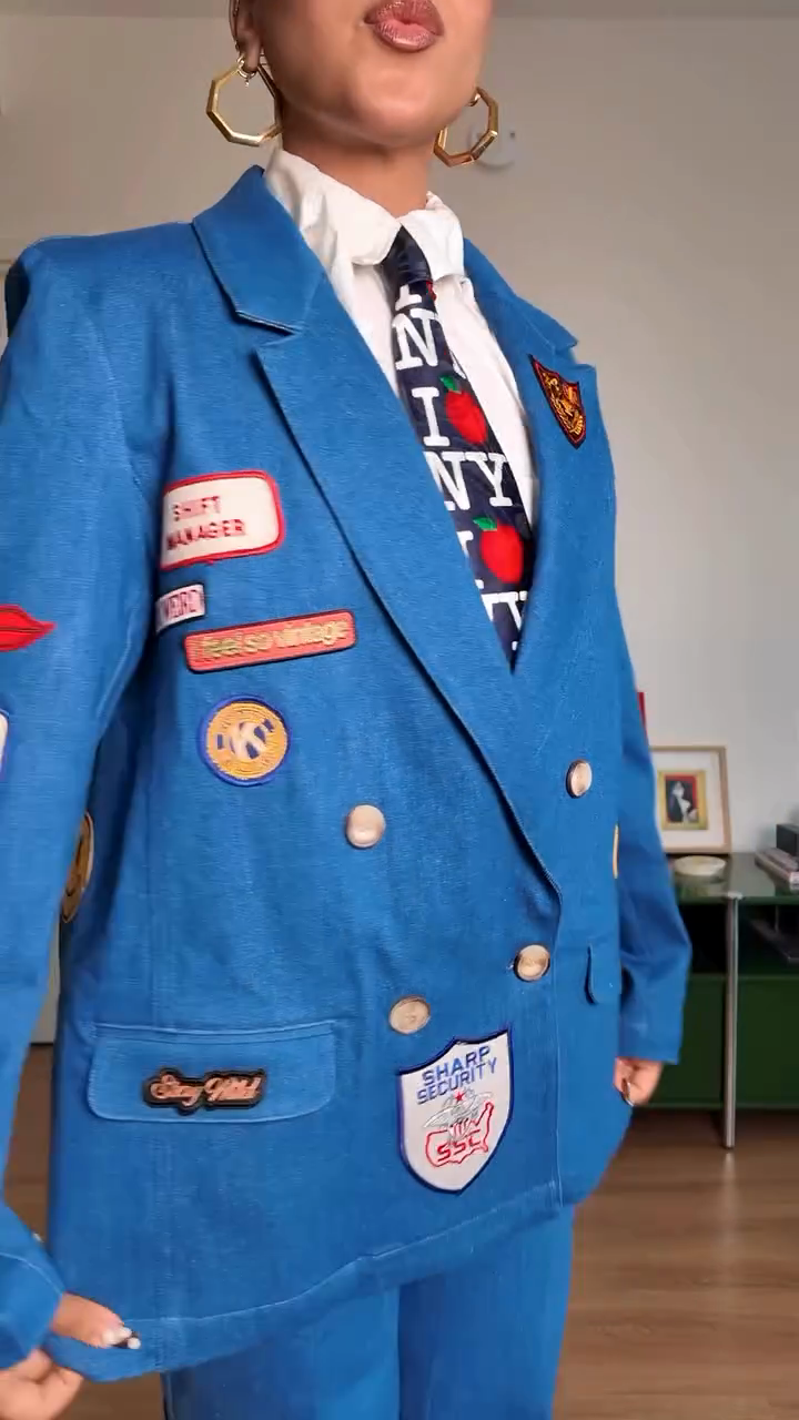 This set features a blue denim blazer and matching wide - leg pants, both adorned with various colorful patches. The blazer has a double - breasted design, adding a structured yet playful touch. Ideal for casual outings, music festivals, or street - style looks, it allows for self - expression through its unique patchwork details. Pair with simple footwear and minimal accessories to let the patches stand out.