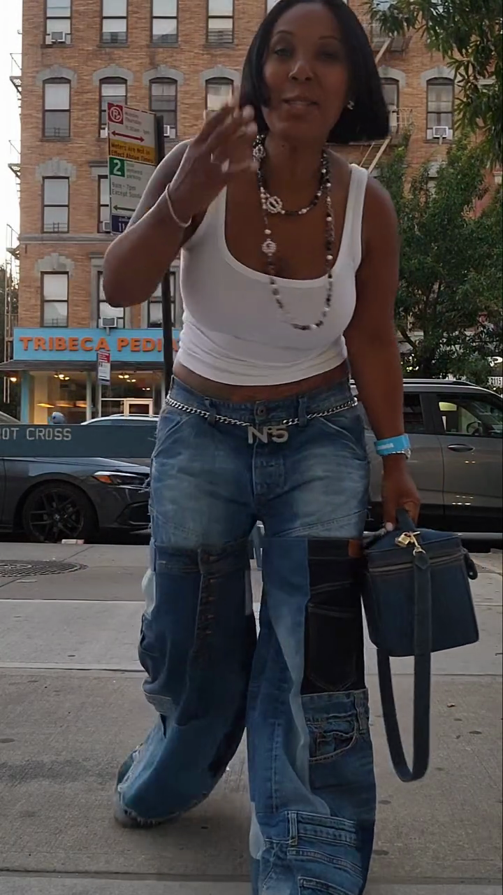 These jeans feature a wide - leg silhouette, crafted from various patches of denim in different shades of blue. The patchwork design gives them a unique, edgy, and vintage - inspired look. Paired with a simple white cropped tank top, they create a casual yet fashionable outfit. The jeans also have a silver chain belt, adding a touch of glam and personality to the overall look.