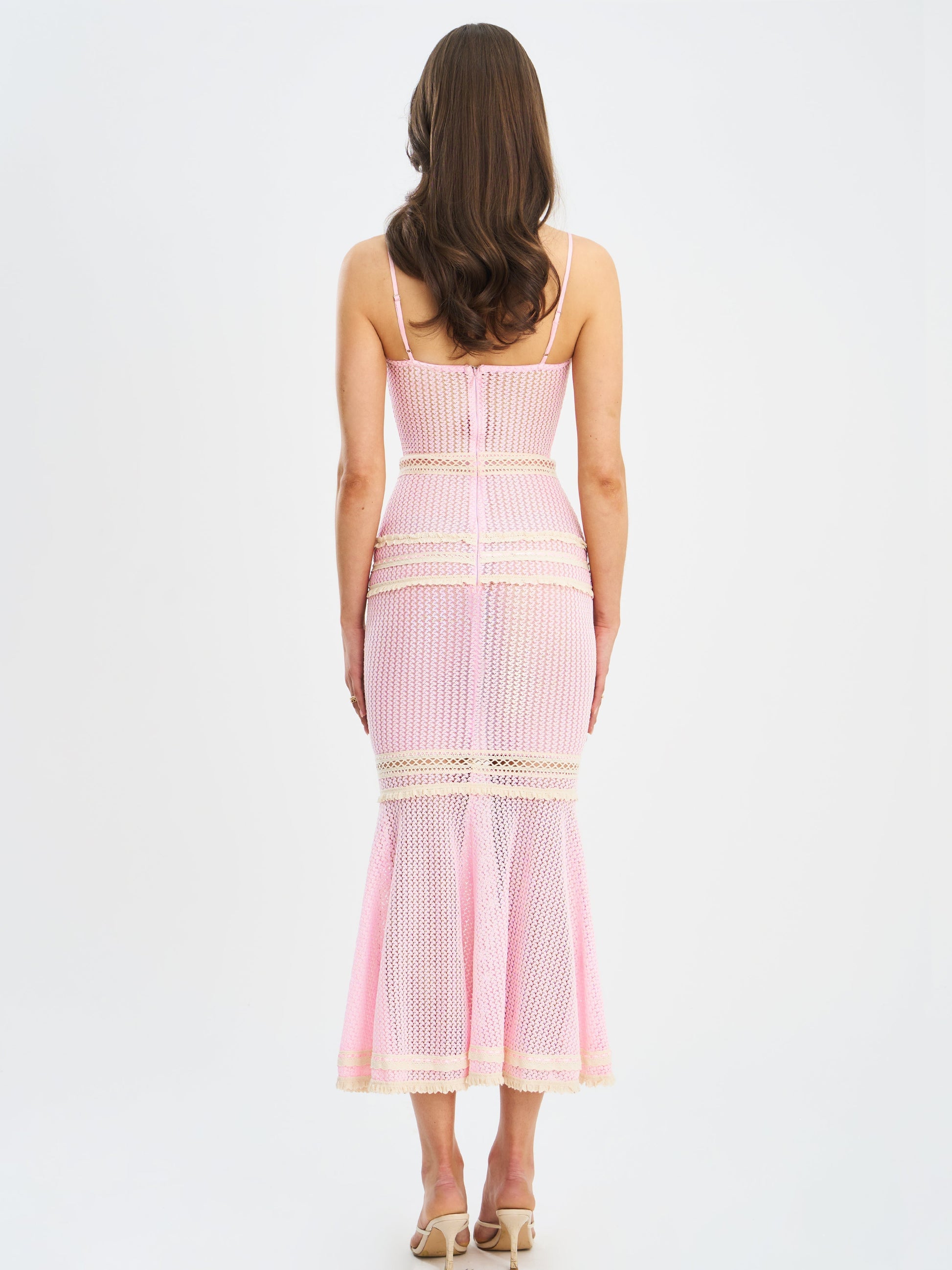 This pink dress features a strapless, sweetheart - neckline bodice with thin spaghetti straps. The fabric is a delicate, open - knit crochet, with horizontal bands of cream - colored lace trim that accentuate the figure. The dress has a form - fitting silhouette that flares out at the bottom in a mermaid style, and includes a side slit for added movement and allure. Paired with simple strappy sandals, it's suitable for semi - formal events like cocktail parties, summer weddings, or evening garden parties.