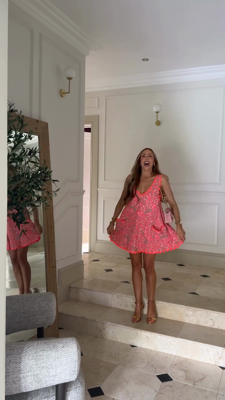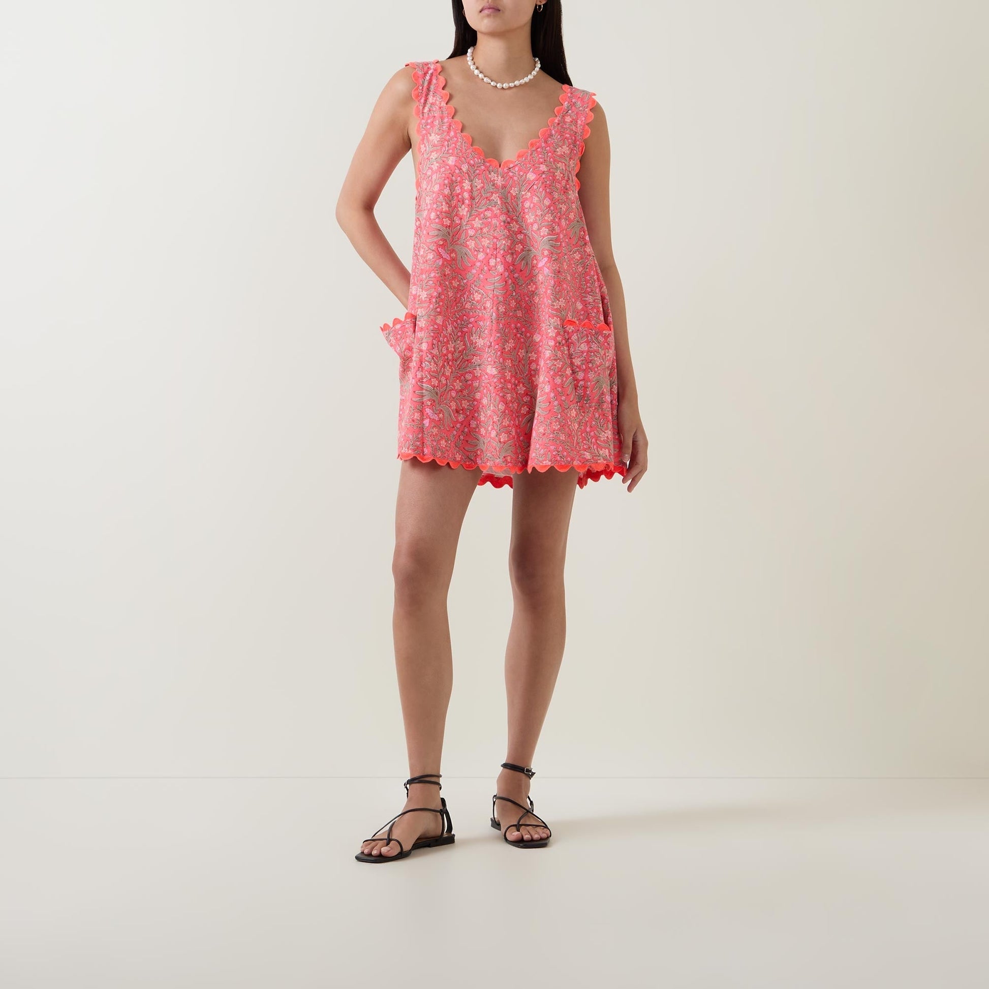 This sleeveless mini dress features a vibrant pink color adorned with intricate floral embroidery in muted tones. It has a V - neckline with scalloped edging in a bright coral color, which is echoed at the hemline. The dress also includes side pockets, adding both style and functionality. Paired with a pearl necklace, the outfit exudes a feminine, summery vibe, suitable for garden parties, beachside events, or casual daytime outings.