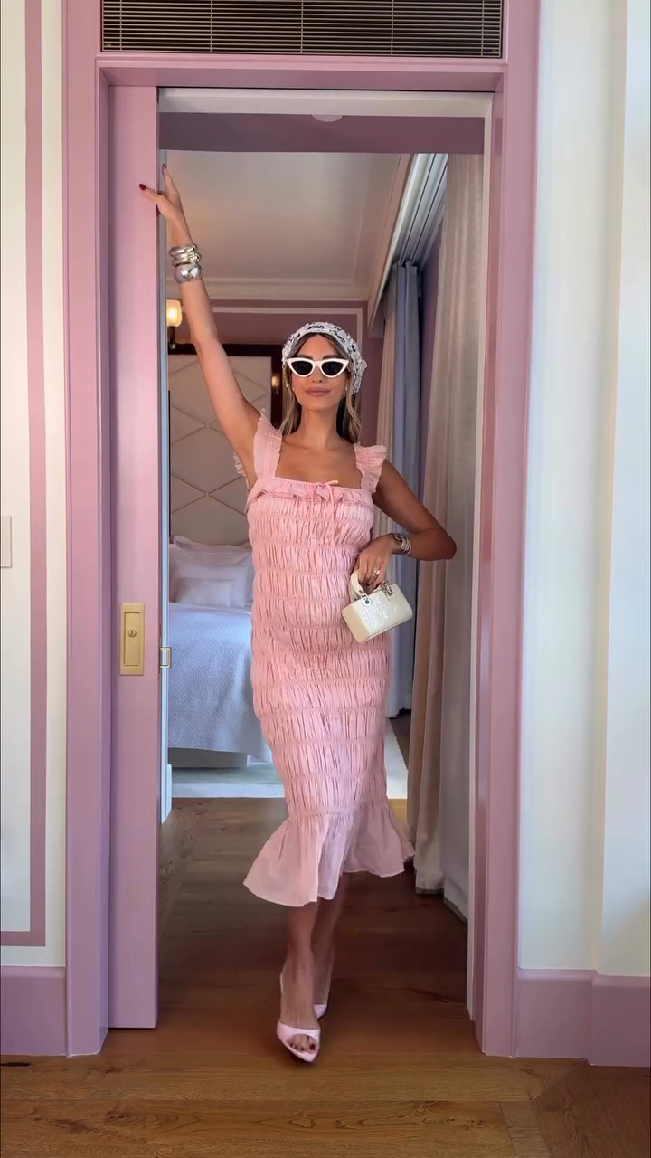 Pink Ruched Midi Dress with Ruffled Straps