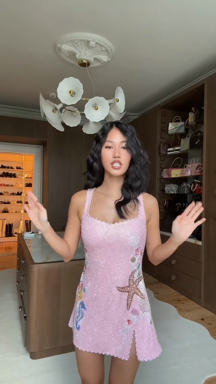 This pink mini dress features a square neckline and thin shoulder straps. The dress is adorned with sequins, creating a sparkling effect, and is decorated with charming marine - themed embroidery, including a starfish, seahorse, and other oceanic elements. There is also a side slit, adding a hint of allure. Ideal for beach - themed parties, summer events, or casual evening outings, it combines a playful, ocean - inspired aesthetic with glamorous sequin detailing.