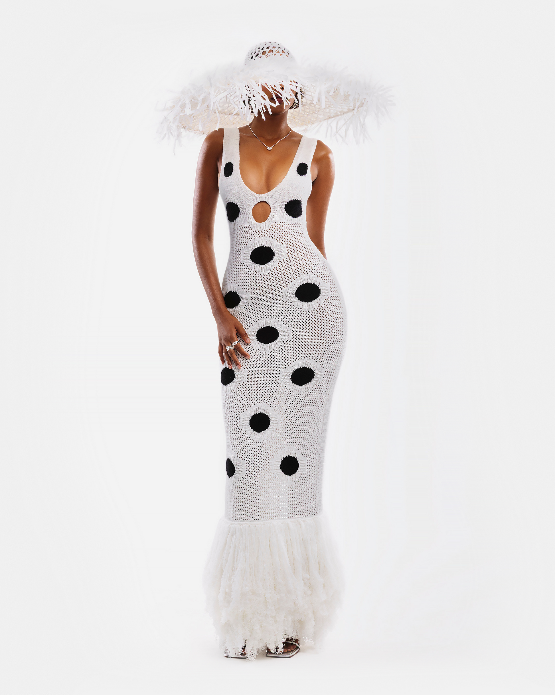 This white maxi dress is a unique and stylish piece. It features a crochet design with large black polka dots, adding a playful and retro touch. The dress has a deep V - neckline and a cut - out detail at the chest, creating an alluring look.