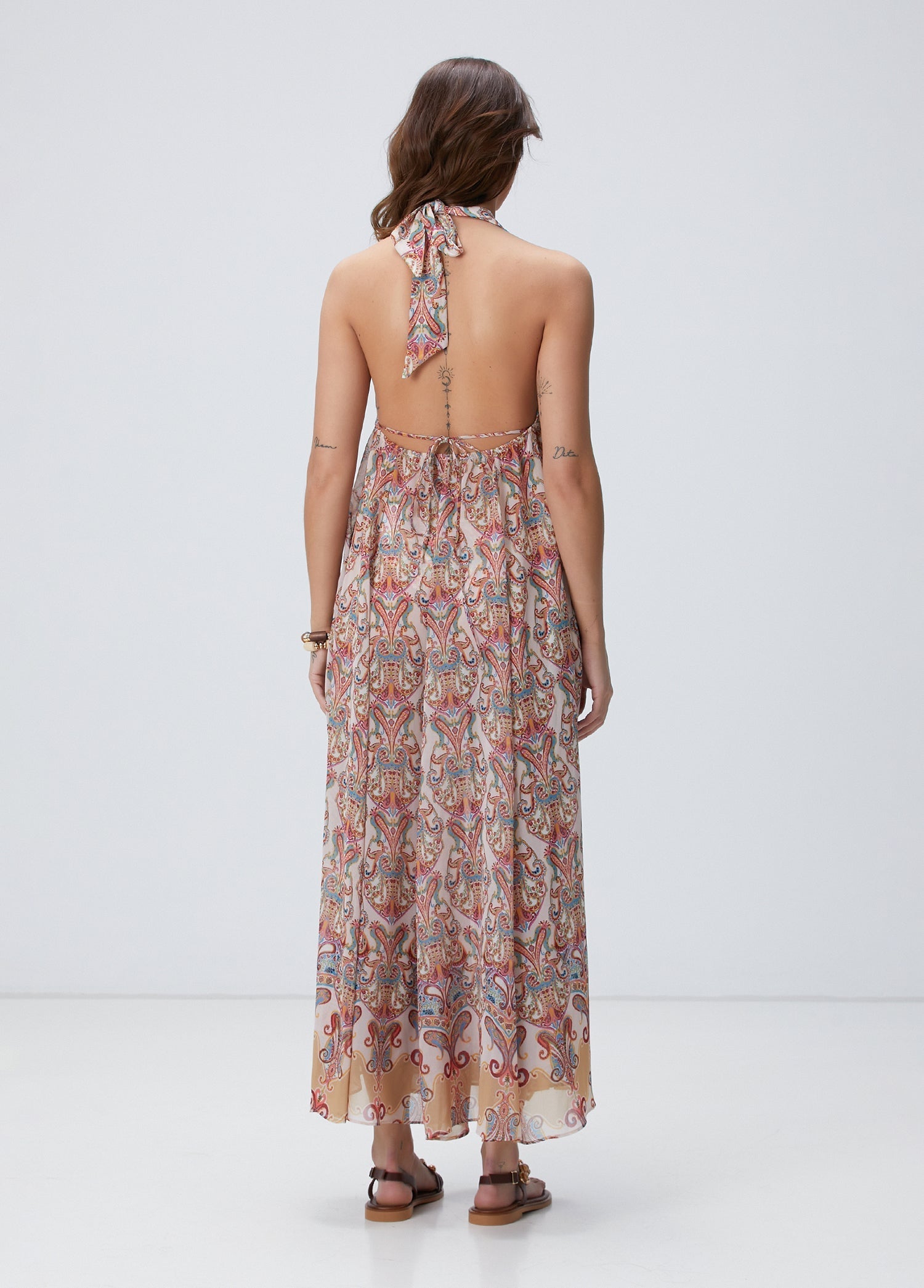 Elevate your summer wardrobe with this Printed Halter Neck Maxi Dress. The halter neckline, flowing silhouette, and intricate print create a bohemian - inspired, elegant look. Perfect for beach vacations, garden parties, or sunset dinners. Pair with strappy sandals and a woven bag to complete the effortlessly stylish ensemble.