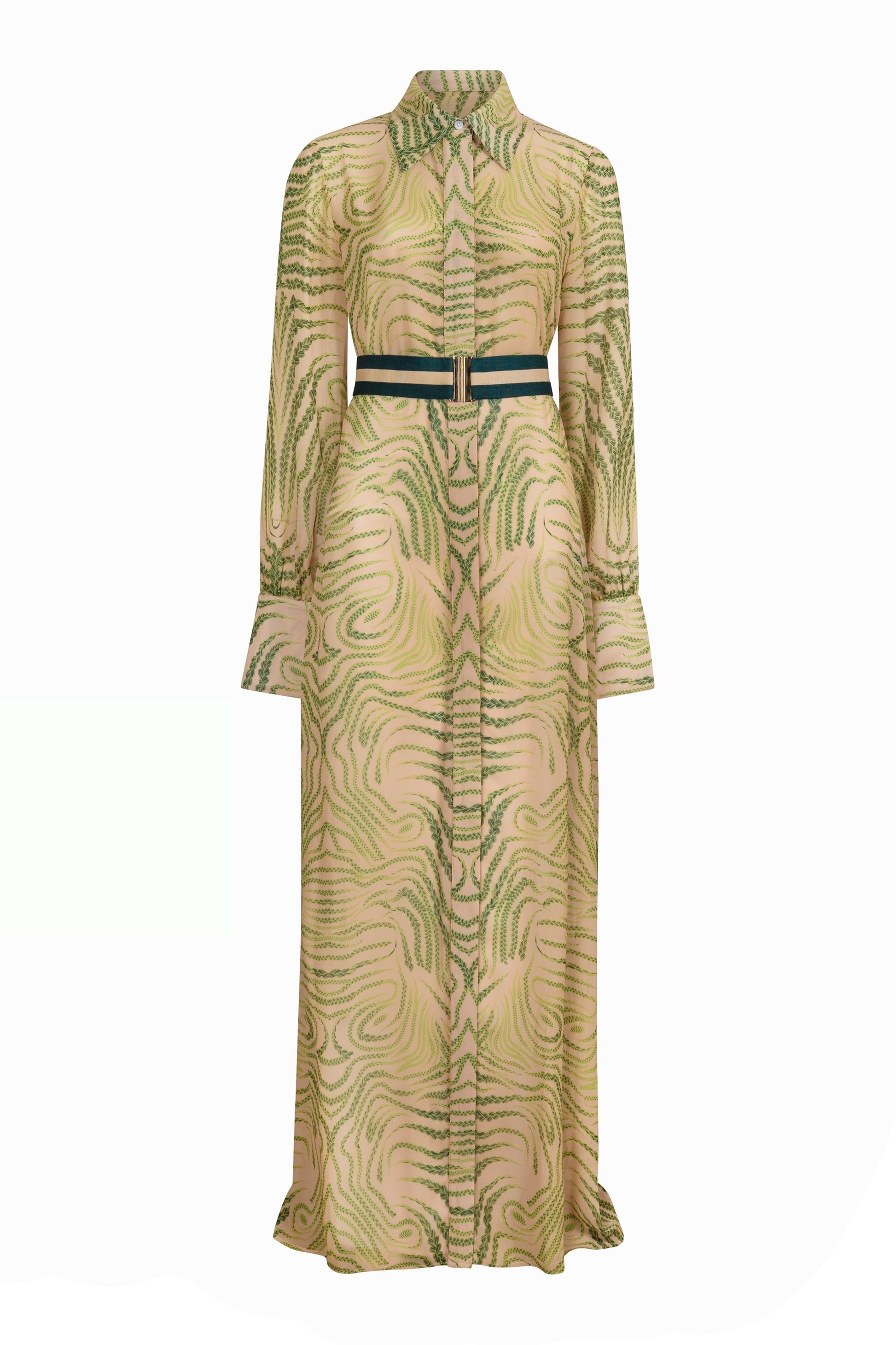 Elevate your wardrobe with this Printed Shirt Dress. Featuring a collared neckline, long sleeves, and a green - belted waist, the dress combines a classic silhouette with a unique, swirling print. Perfect for adding a sophisticated, artistic touch to your looks. Pair with heels or ankle boots for a polished ensemble, suitable for work or special outings.