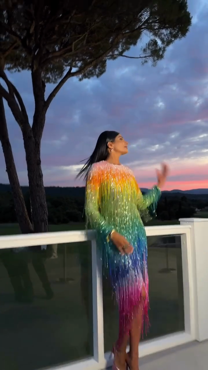 This dress features a stunning rainbow color gradient, covered entirely in sequins with long, flowing fringes. It has long sleeves and a high - slit design, adding a touch of allure. Ideal for high - profile events, parties, or glamorous evenings, the dress combines vibrant colors with eye - catching sequin and fringe details to create a show - stopping look.
