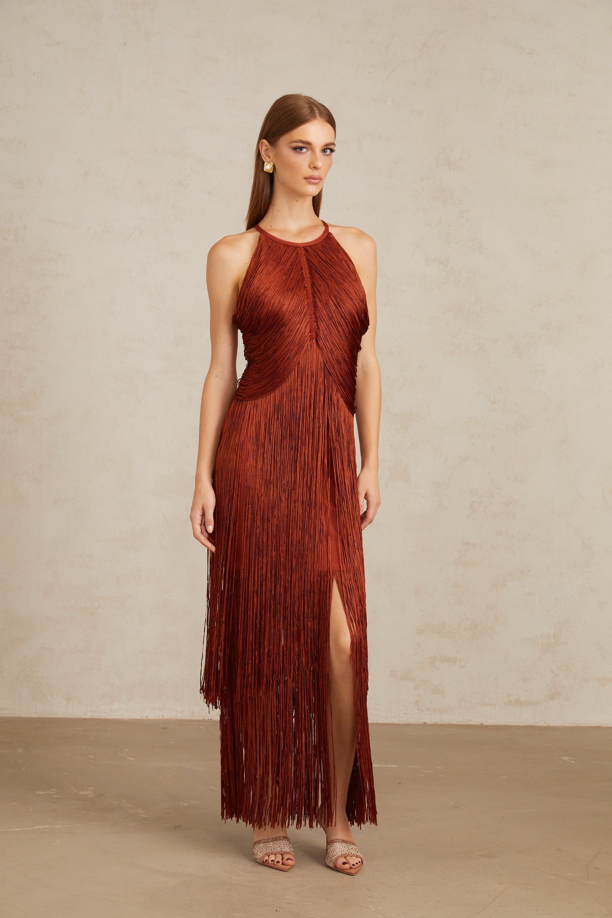 Reddish - Brown Halter Fringe Maxi Dress
