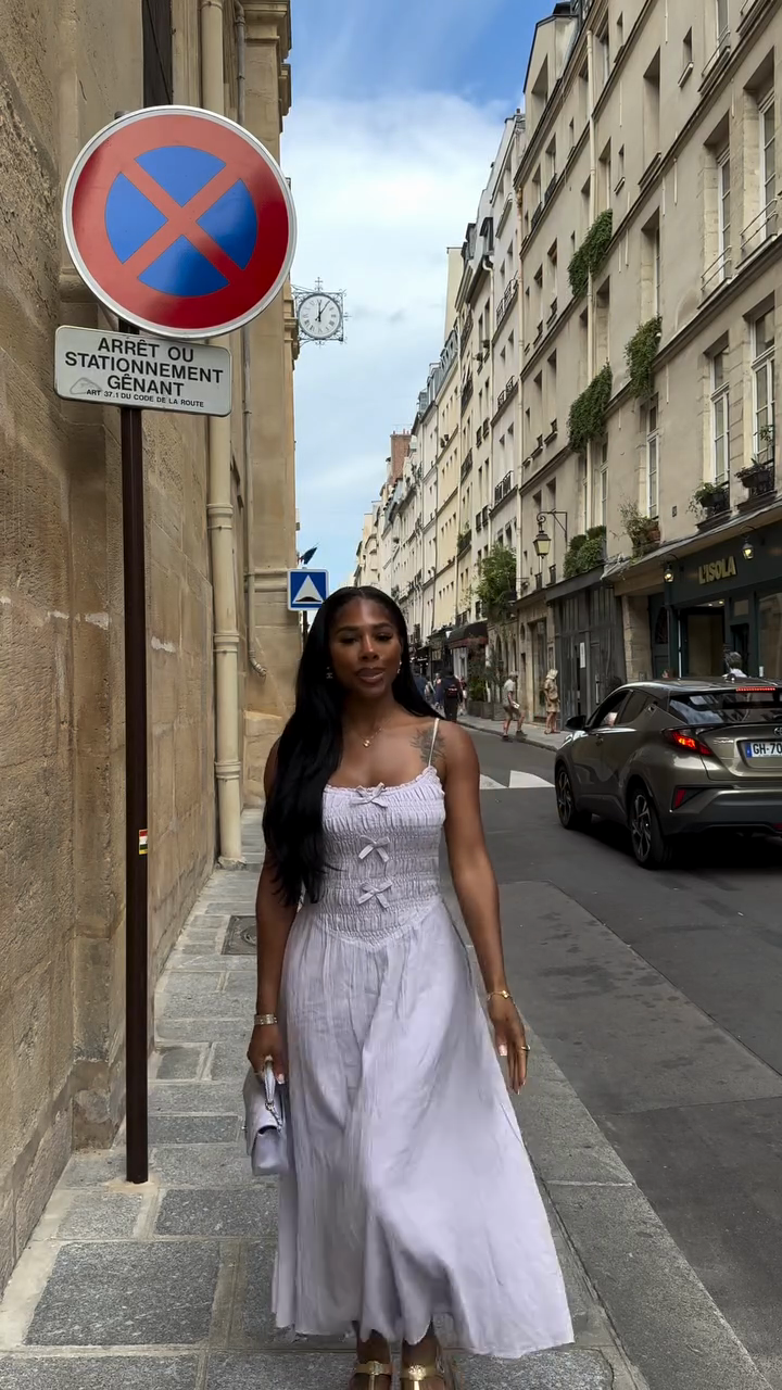 - Design: Smocked bodice, bow accents, square neckline, spaghetti straps, side pockets, and maxi length.