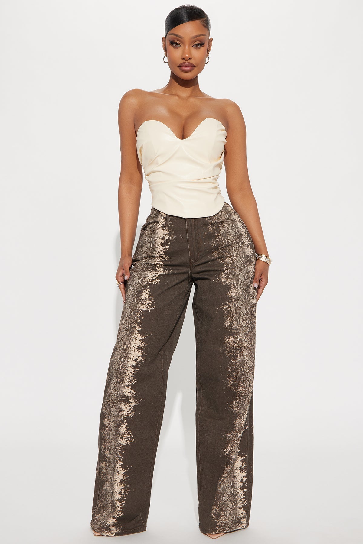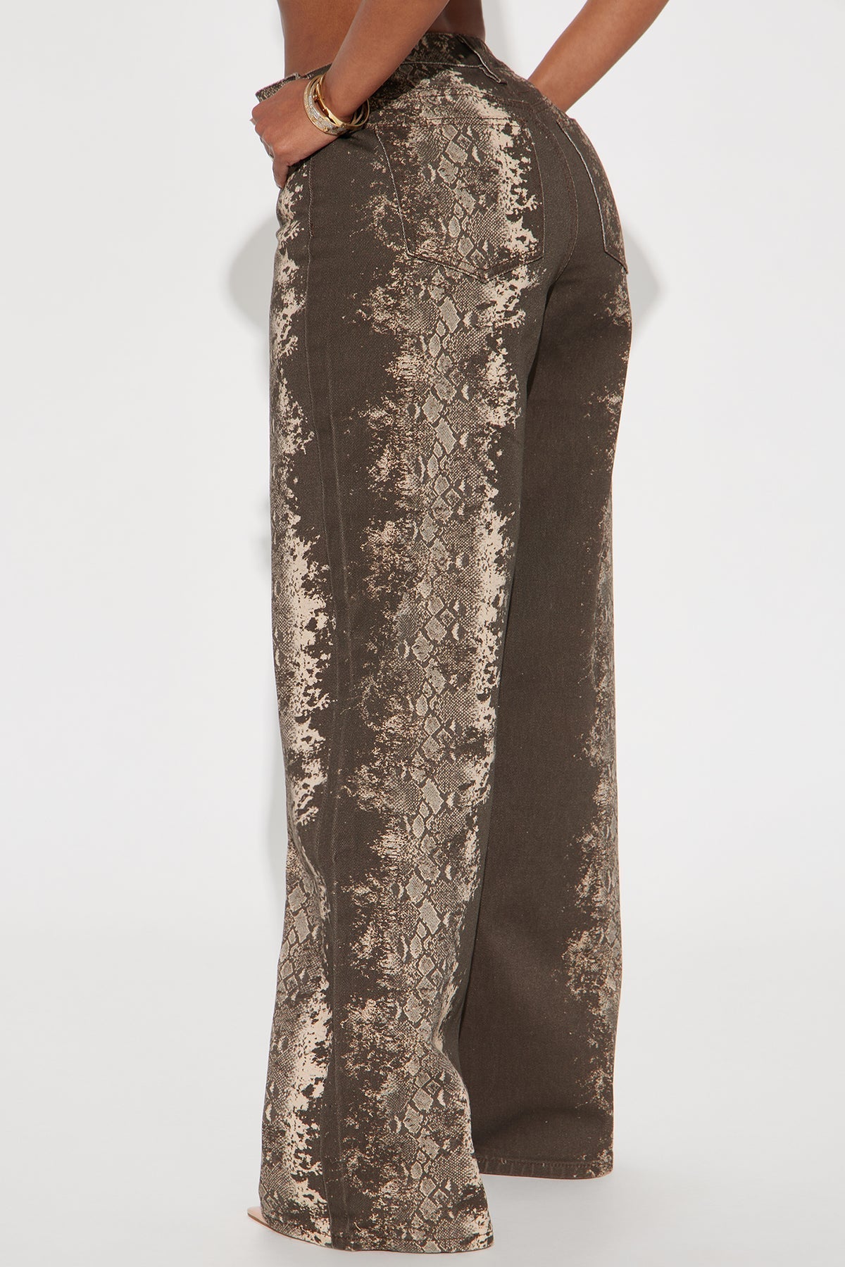 Make a bold fashion statement with these Snake Print Distressed Wide - Leg Jeans. The unique snake pattern, distressed detailing, and wide - leg silhouette create an edgy, trendy look. Perfect for casual outings, street style events, or adding a touch of fierceness to your wardrobe. Pair with a simple crop top and chunky sneakers to complete the urban ensemble.