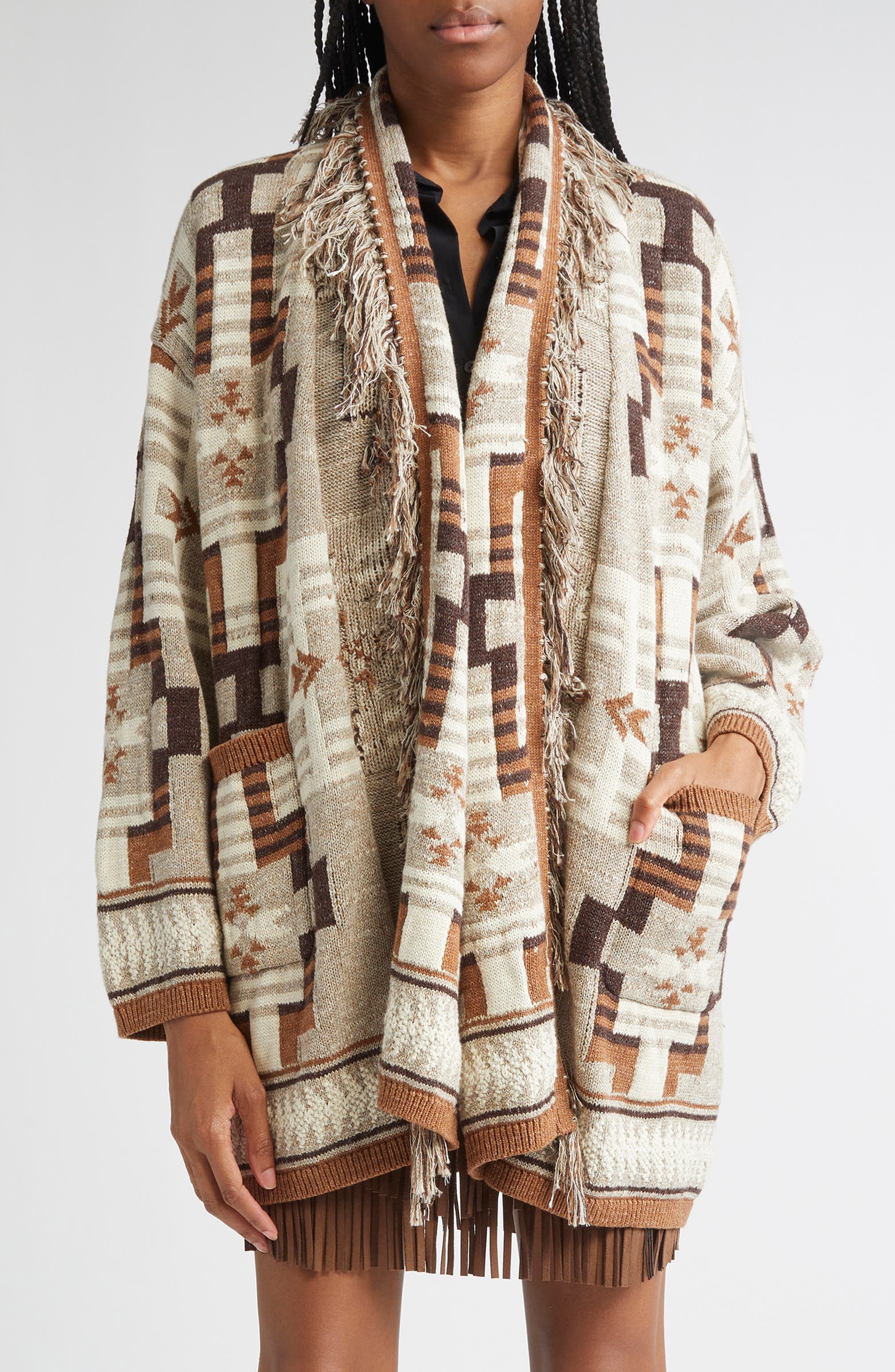 This cardigan features a southwestern - inspired pattern with geometric designs in shades of beige, brown, and cream. It has long sleeves, a draped front, and prominent fringes along the edges, adding a bohemian touch. The cardigan also includes pockets, enhancing its functionality. Paired with a dark top and a brown fringed skirt or shorts, it creates a stylish, casual look perfect for fall or spring, capturing a free - spirited and trendy aesthetic.