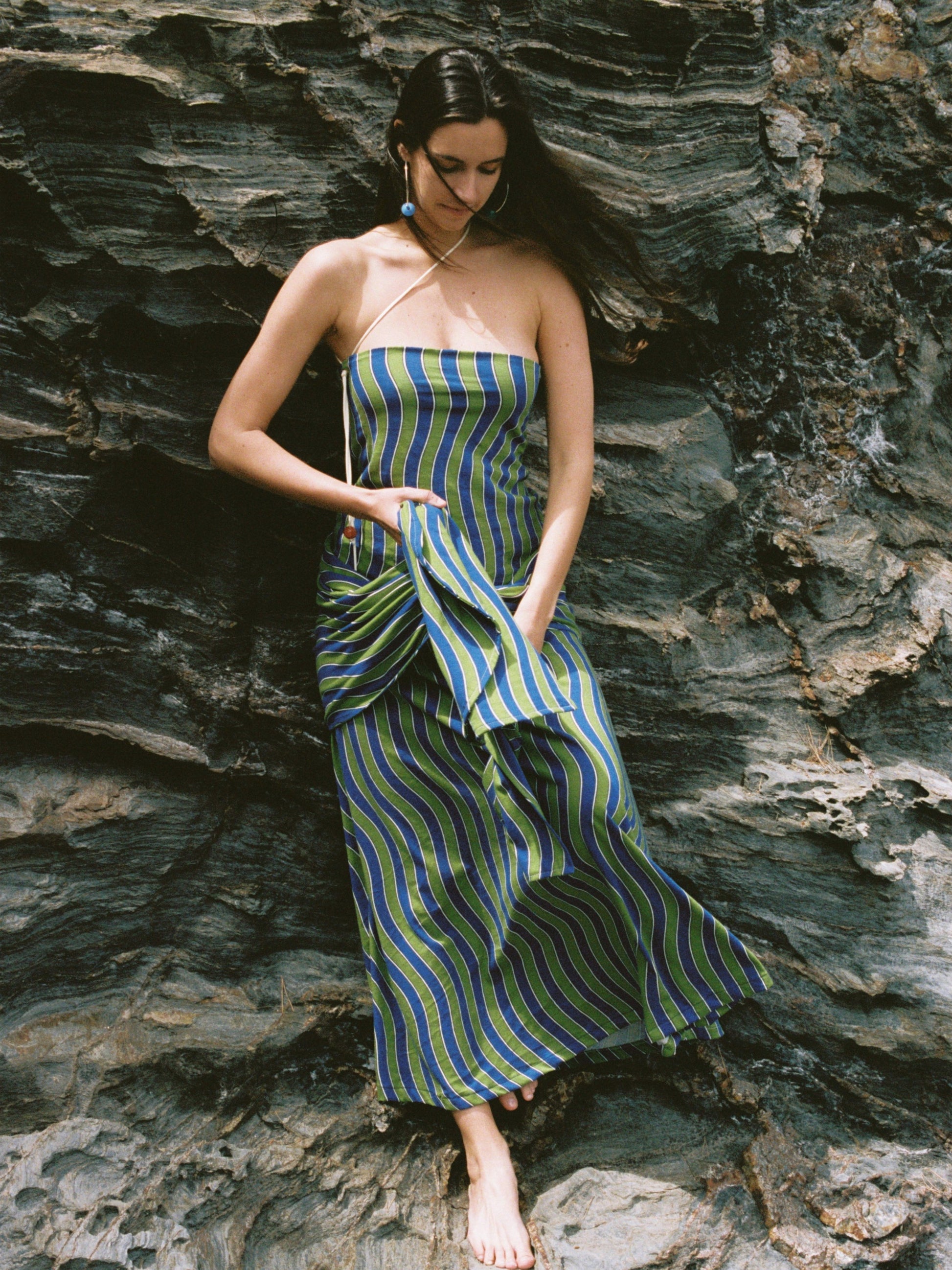 This strapless maxi dress features a striking pattern with alternating blue and green stripes. The fabric appears to be draped in a way that creates a knot - like detail around the waist, adding a unique and stylish element to the silhouette. Paired with a pearl necklace that has colorful bead accents, the dress exudes a casual yet chic vibe, perfect for a beachside setting. It's suitable for warm - weather outings, beach parties, or simply enjoying a day by the sea.