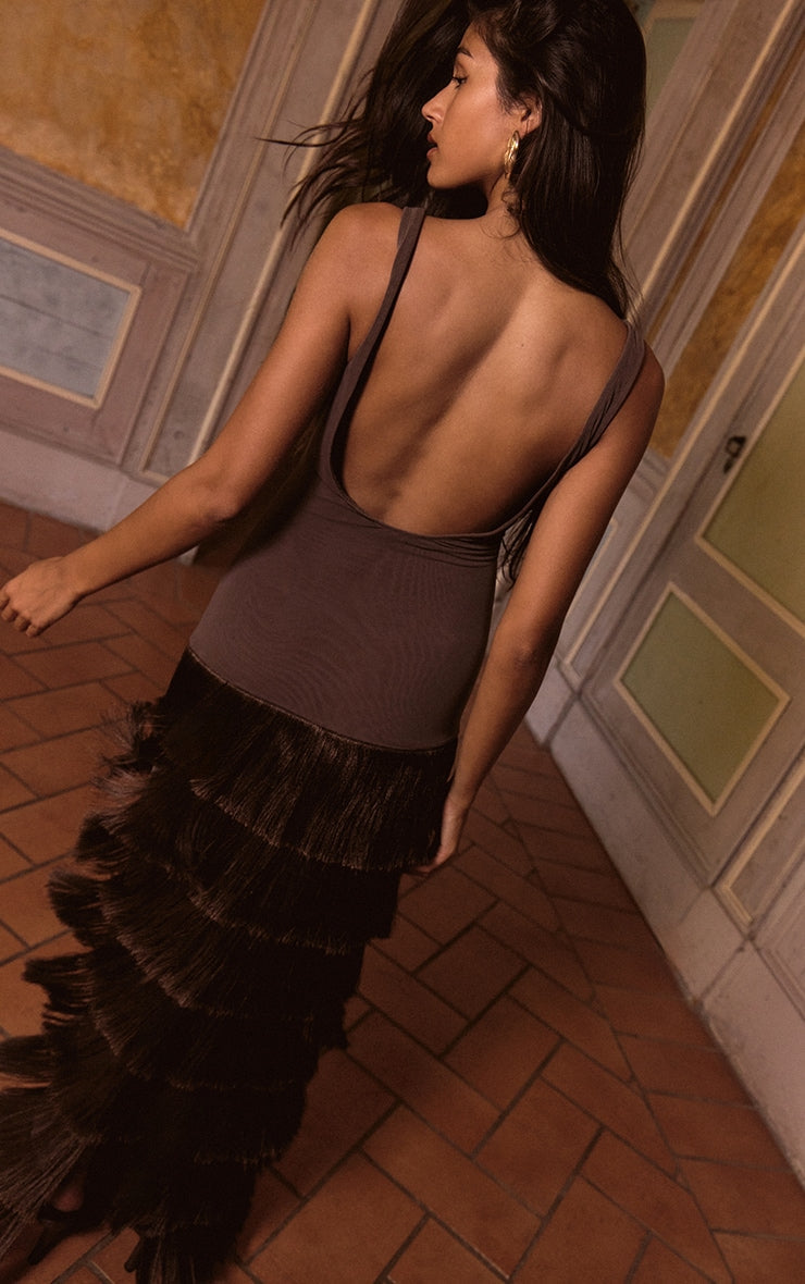 This elegant maxi dress features a form - fitting, scoop - neck bodice in a rich brown hue, transitioning into a tiered fringe skirt that adds movement and flair. The sleek, minimalist design is perfect for formal events, parties, or a night out, blending sophistication with a touch of bohemian charm.