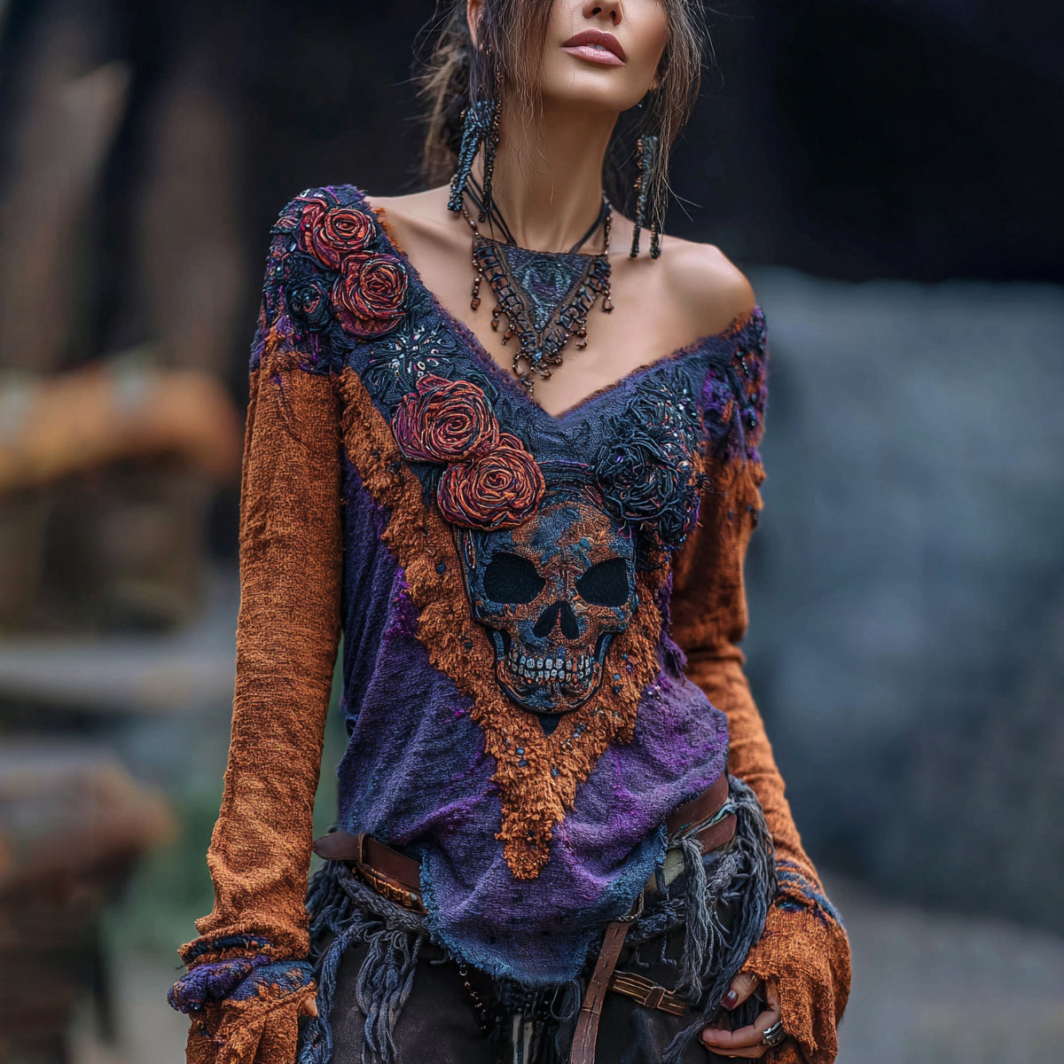 Vintage Rose Skull Rhinestone Contrast V Neck T-shirt