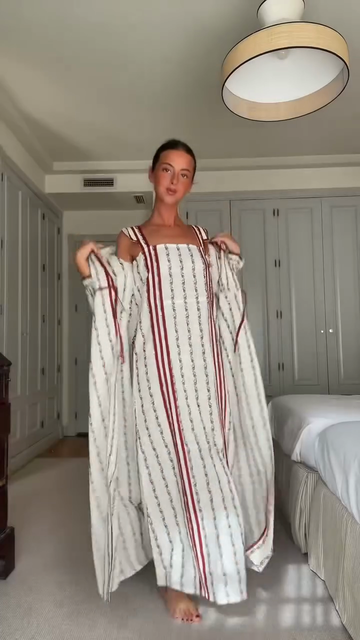 This maxi dress is a stylish and elegant piece. It features a V - neckline with a tie - up detail at the front, adding a touch of charm and allowing for adjustable fit. The long sleeves are slightly puffed, giving a vintage - inspired look. The dress is adorned with vertical maroon stripes that contrast with the white base, creating a visually appealing pattern.