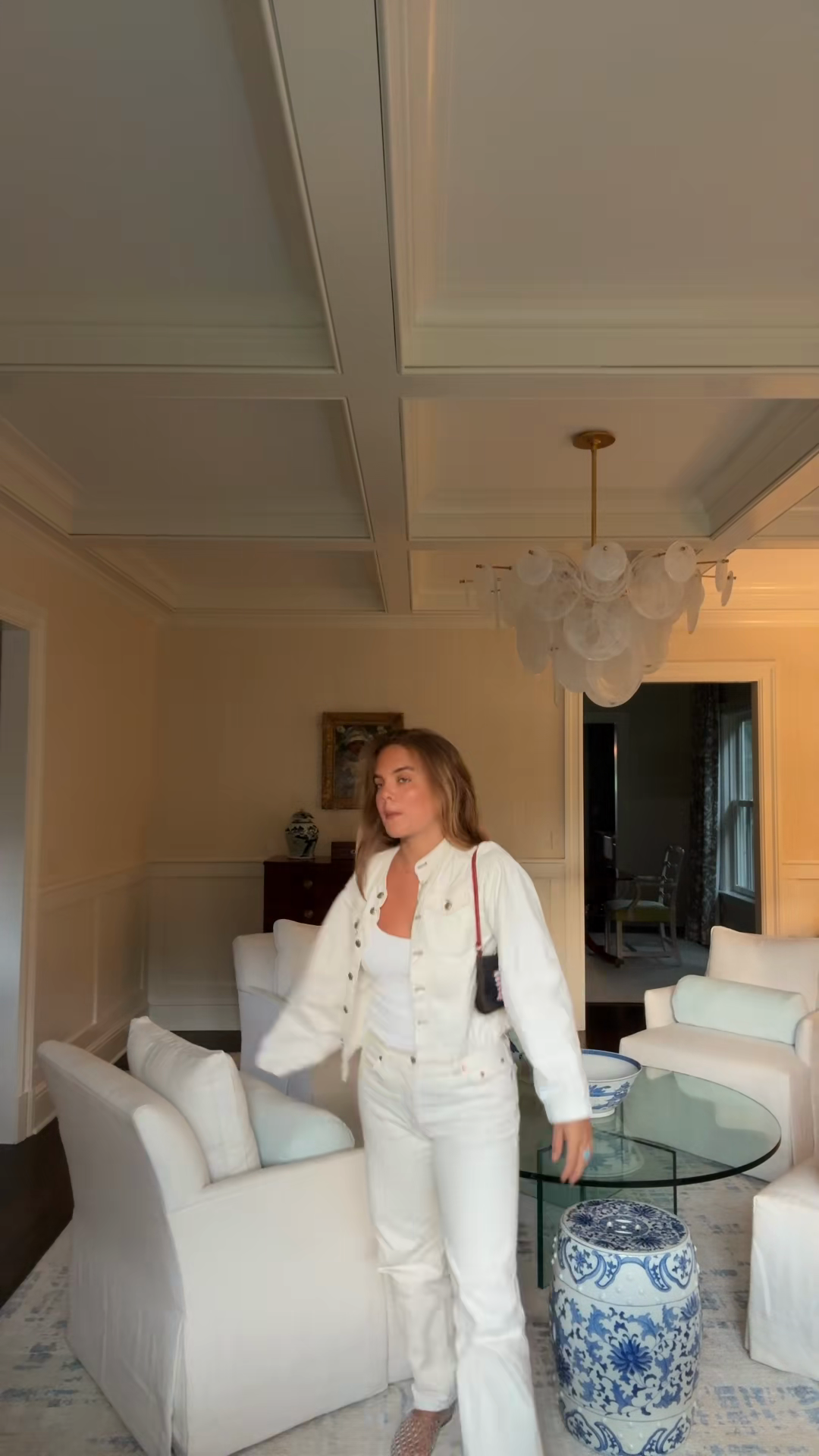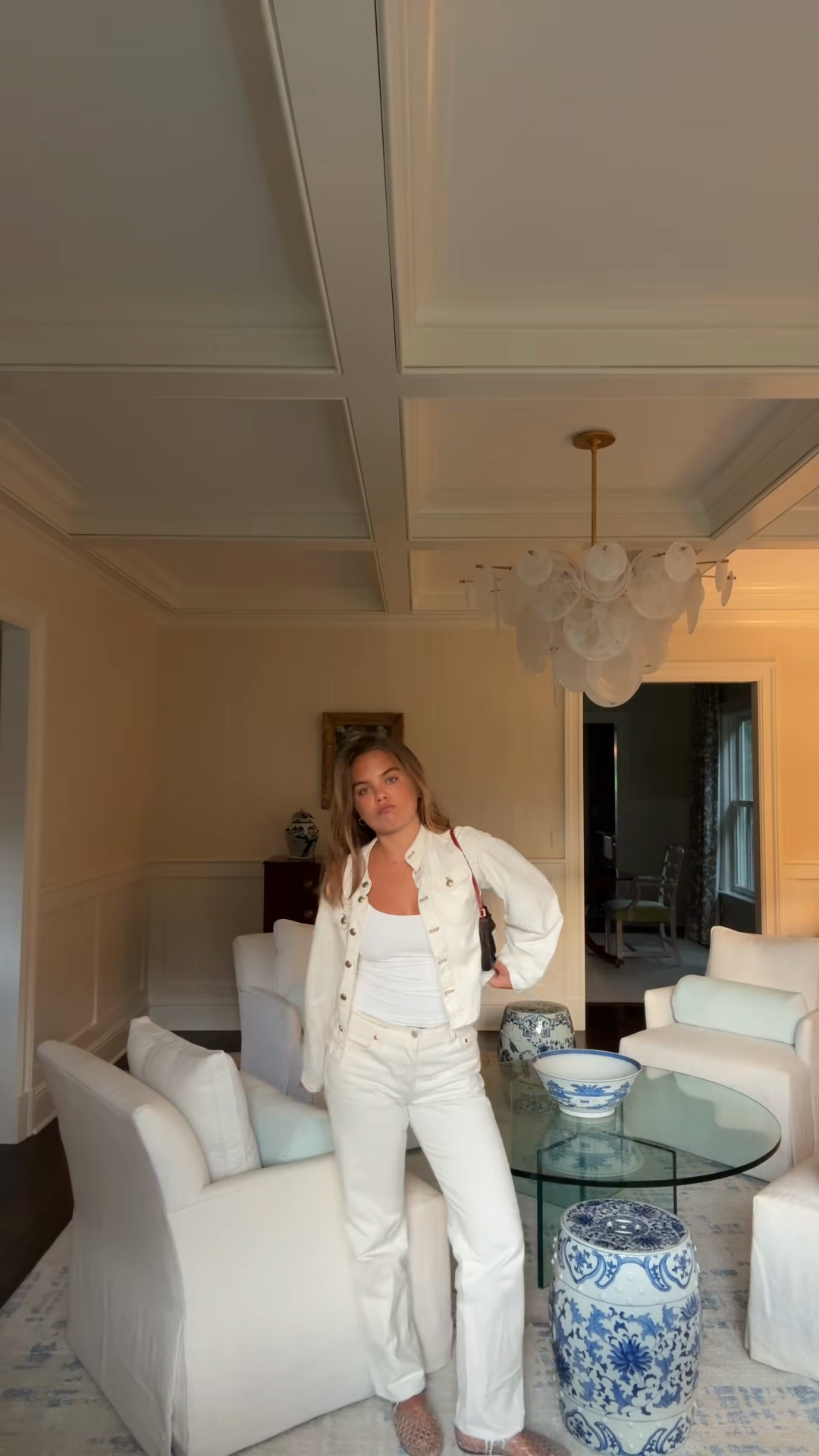 This all - white ensemble features a white denim jacket with a classic button - up design and a simple white tank top underneath. Paired with white denim jeans, it creates a clean, cohesive look. The jacket's casual yet structured style, combined with the relaxed fit of the jeans, offers a versatile outfit that can be dressed up or down. Accessories like a small black handbag can add a touch of contrast and sophistication.